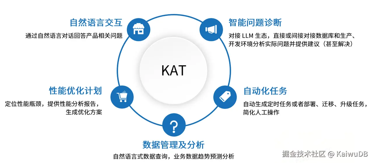 针对这一现状,KaiwuDB 在 AI 与数据库融合领域持续深耕,形成了DB for AI 与 AI for DB 两大核心布局,既打造了适配多场景的预测分析引擎,又推出了 KAT - KaiwuDB 数据库智能体工具,构建起完整的数据库 AI 赋能体系,其中 KAT 作为 AI for DB 领域的核心成果,重点解决用户操作、运维、研发中的各类痛点。