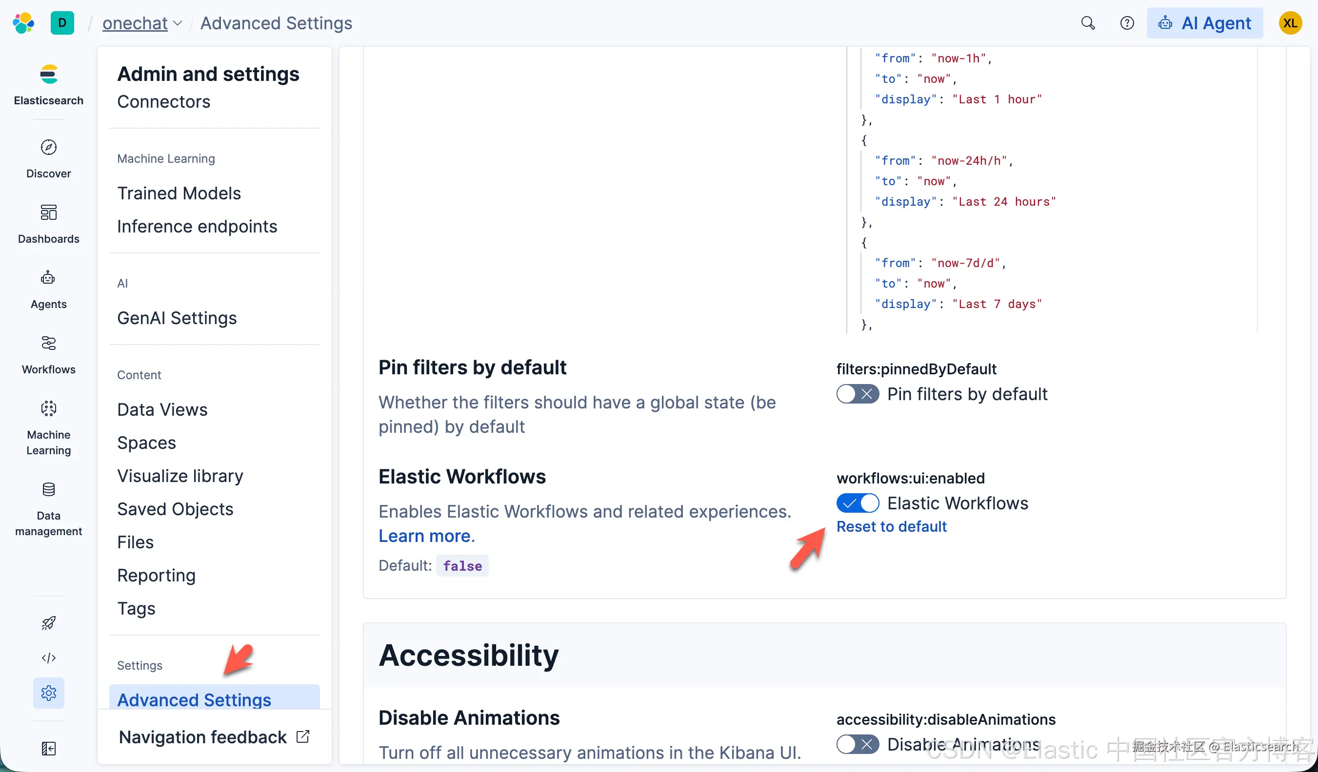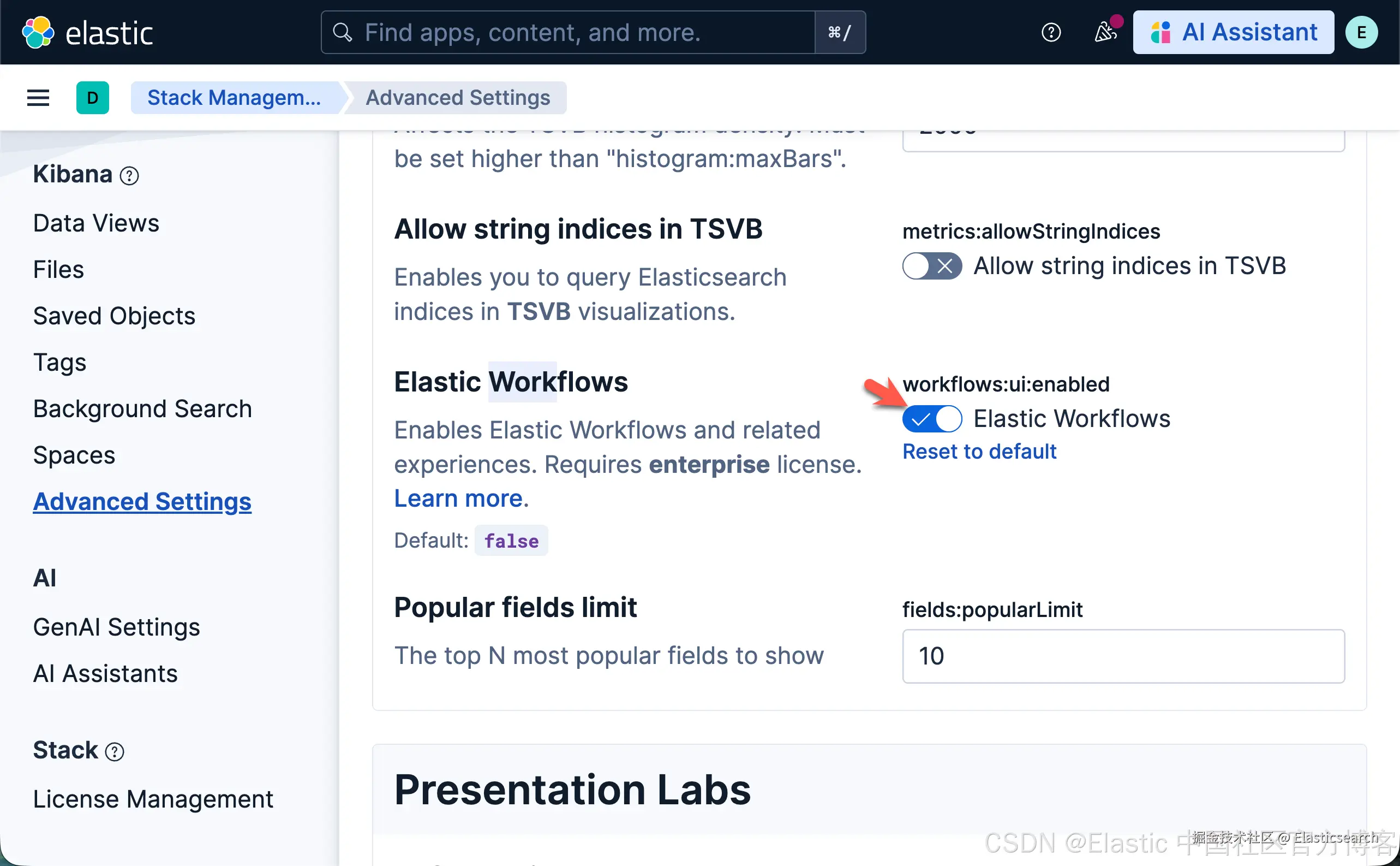 要使用 工作流,请开启 Elastic Workflows(workflows:ui:enabled)高级设置。