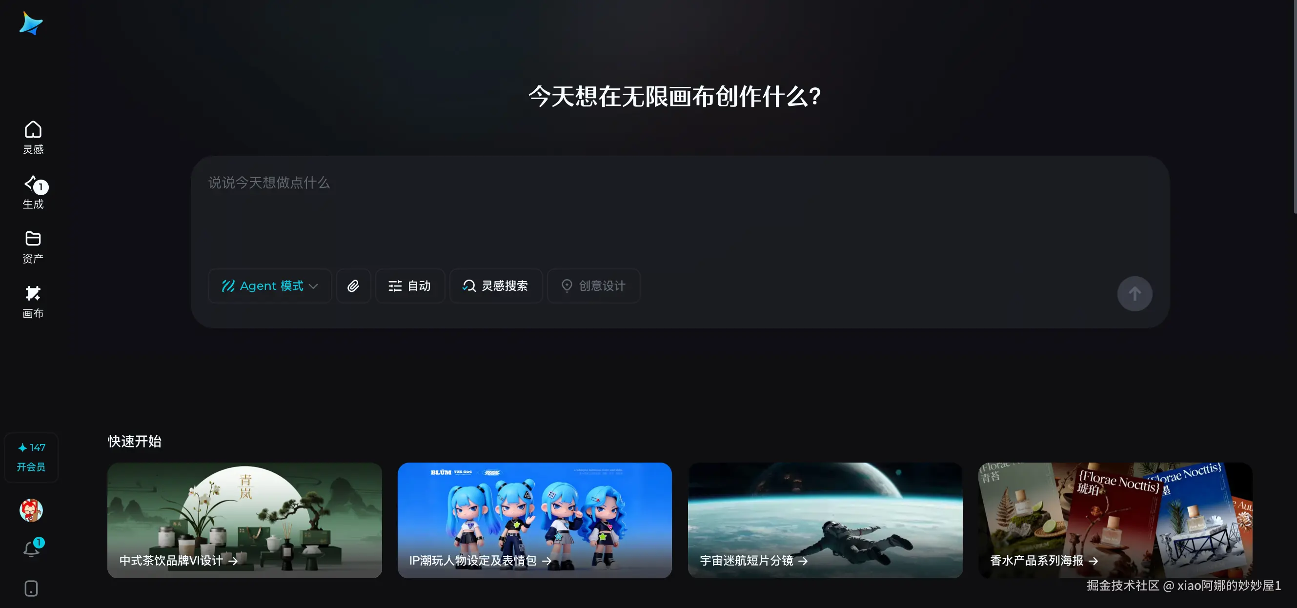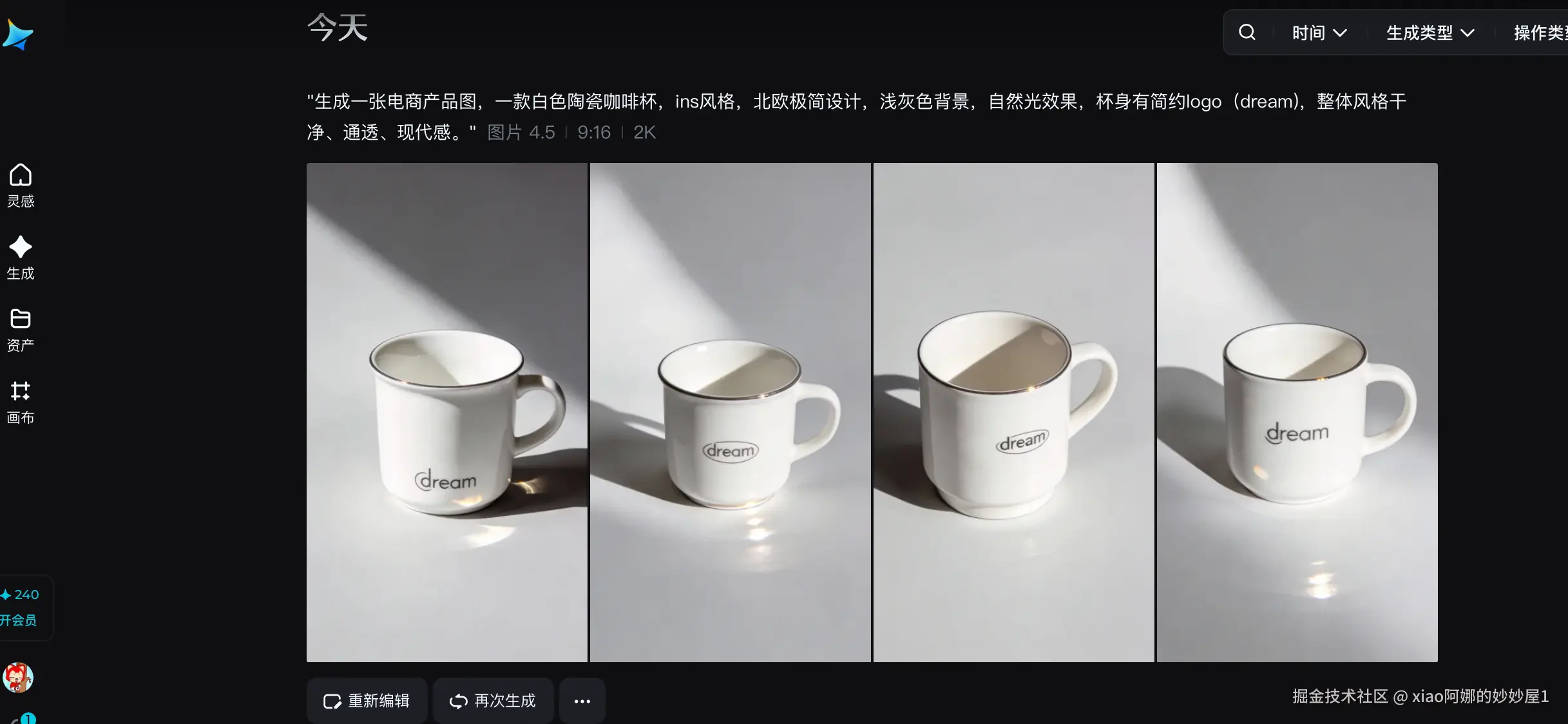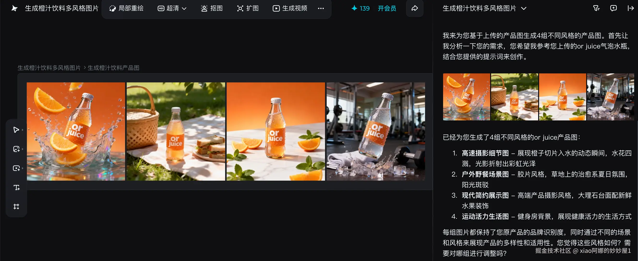 这是即梦最被低估的功能,也是“批量出产品效果图”的核心。 它不是一张张生图,而是一个无限大的工作台。你可以把产品图放进去,利用“参考图”和“局部重绘”功能,保持产品主体不变,一键切换10种不同的背景。