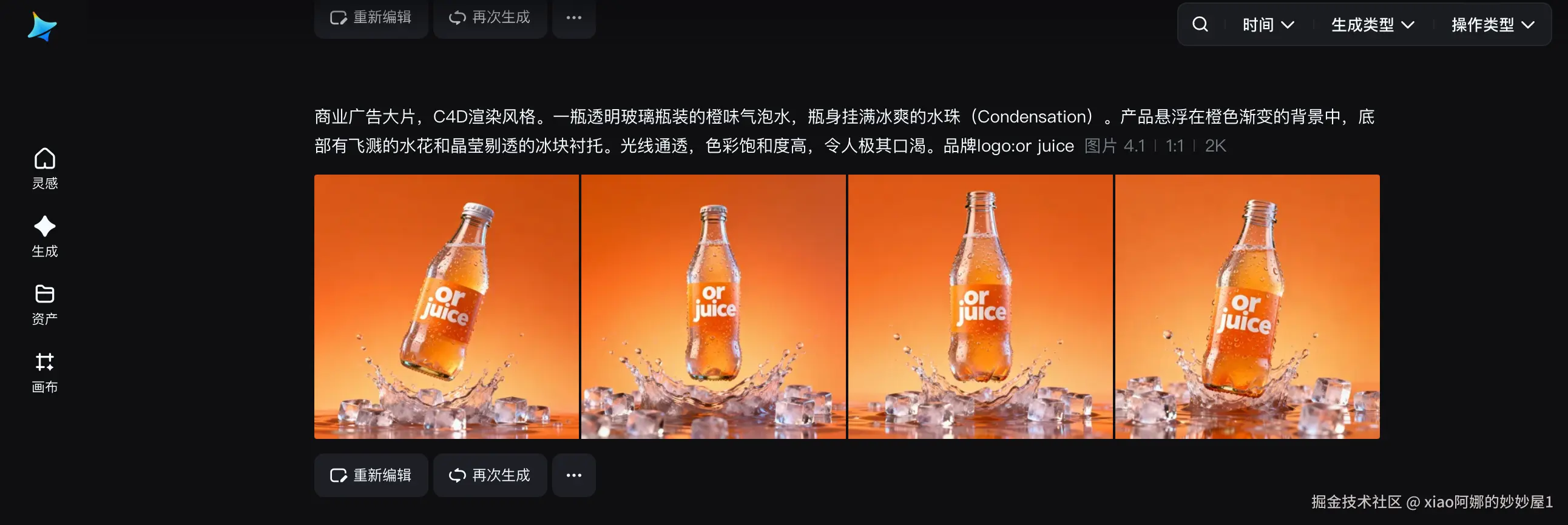 这就是AI的恐怖之处。液体、玻璃、冰块,这些传统摄影的噩梦,即梦4.5生图模型生成出来只需要几秒钟。而且0成本!你可以批量生成100张不同口味(换个颜色就行)的图,铺满整个店铺。