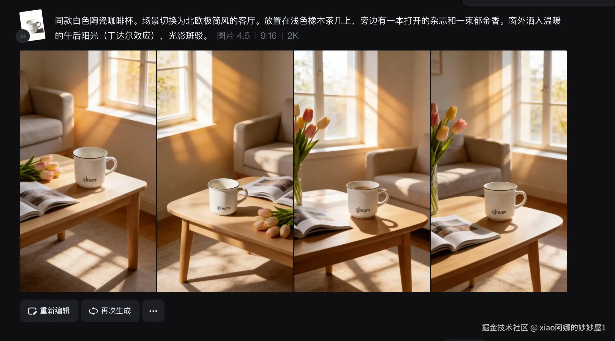 它生成的图片,杯身的陶瓷纹理、光影的反射、背景的虚化,完全是商用摄影级别。这就叫中文语义理解的压倒性优势。