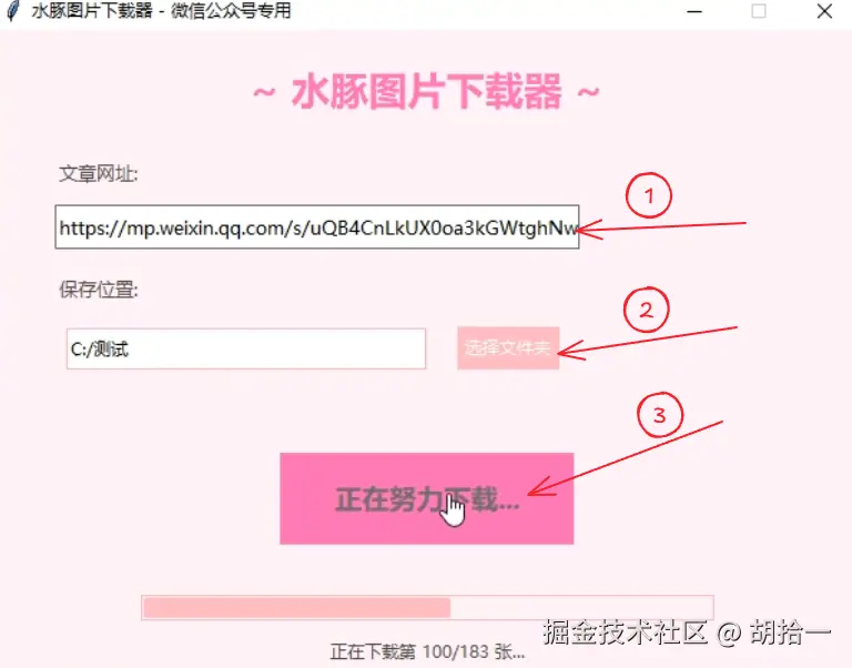 2、打开下载工具,将复制的链接粘贴到工具输入框,再点击选择图片保存目录,点击开始下载,工具会自动解析文章并批量下载所有图片,页面会显示下载进度条,等待几秒即可完成,不用手动值守。