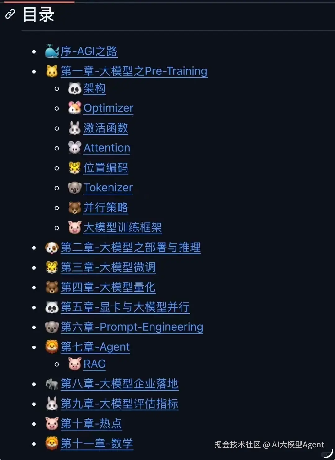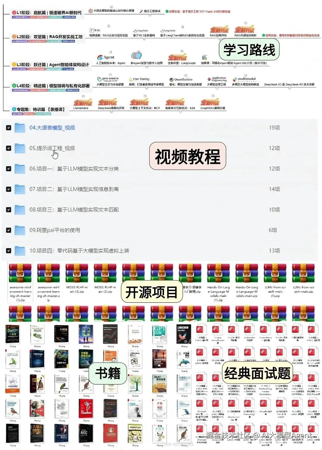 - 内容超全:从大模型的预训练、部署与推理,到微调、量化,再到提示词工程、Agent(智能体)开发,甚至企业落地和评估指标,应有尽有!
