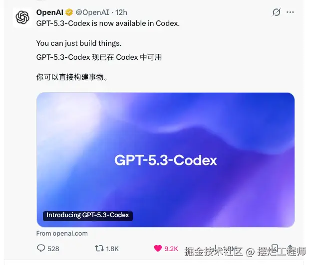 就在凌晨2点时, Claude Opus 4.6 发布了,但是被 OpenAI 阻击了,不到 20 分钟的时间,就甩出了 GPT-5.3-Codex,号称迄今为止最强的代理式编程(agentic coding)模型。