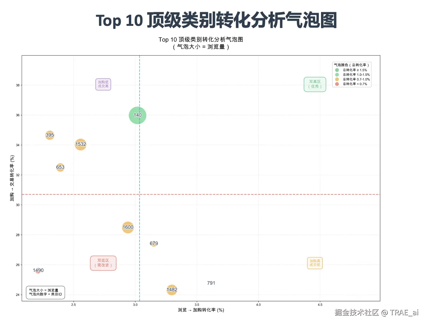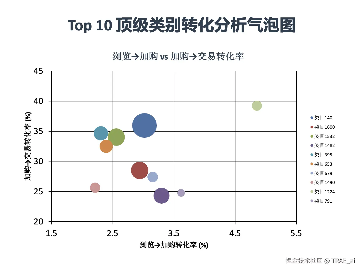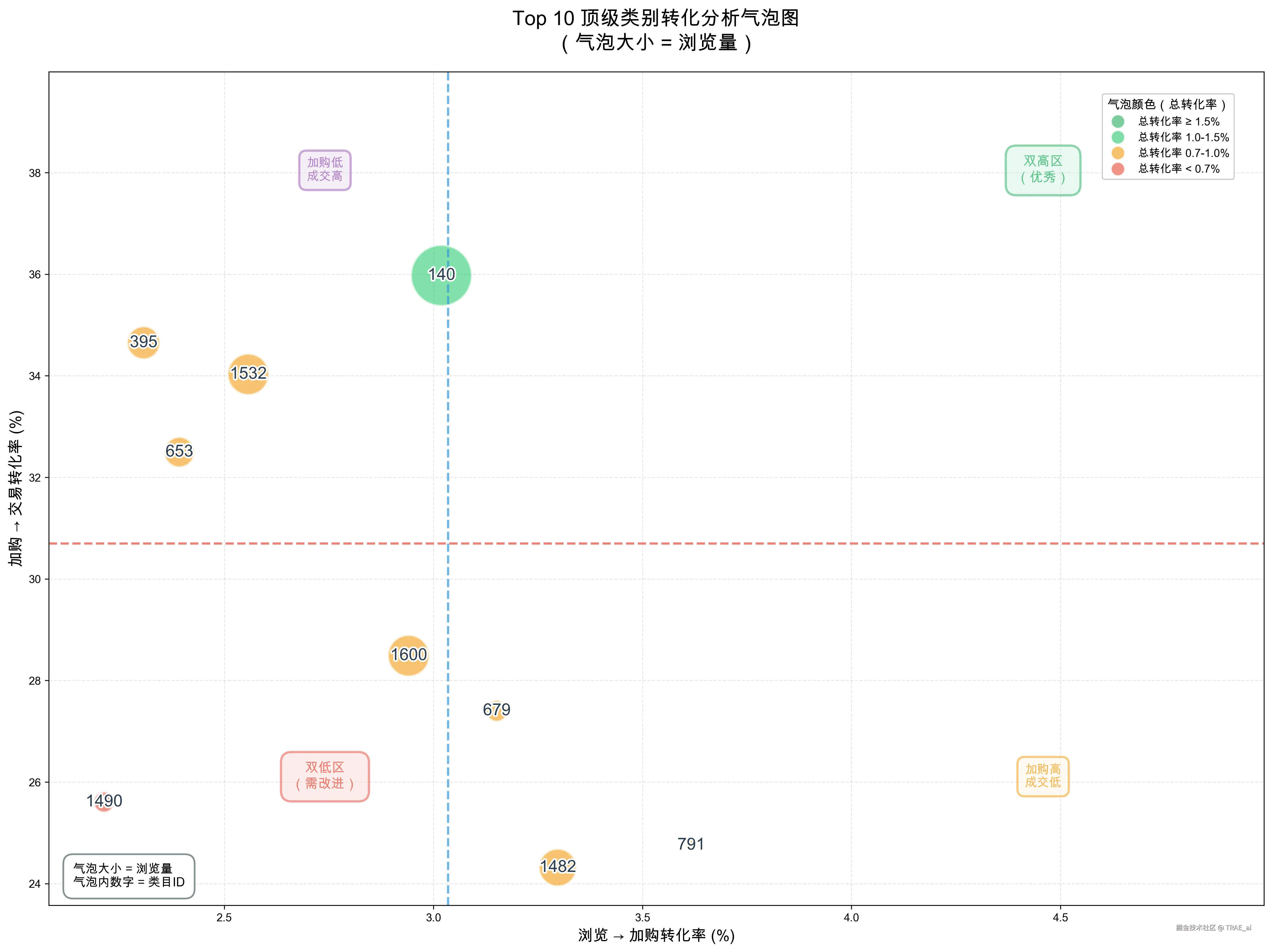 「帮我画一个气泡图,横轴浏览到加购的转化,竖轴是加购到购买的转化,大小是浏览量级,只需要画按浏览量前10个顶级类别」