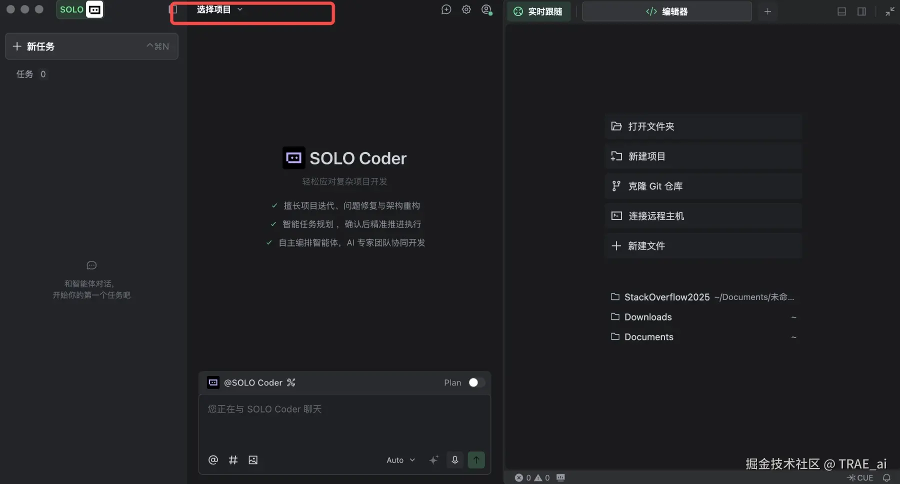 打开 TRAE SOLO 模式: TRAE 目前提供 SOLO 和 IDE 两种模式,本次我将选择 TRAE SOLO 模式来完成需求。