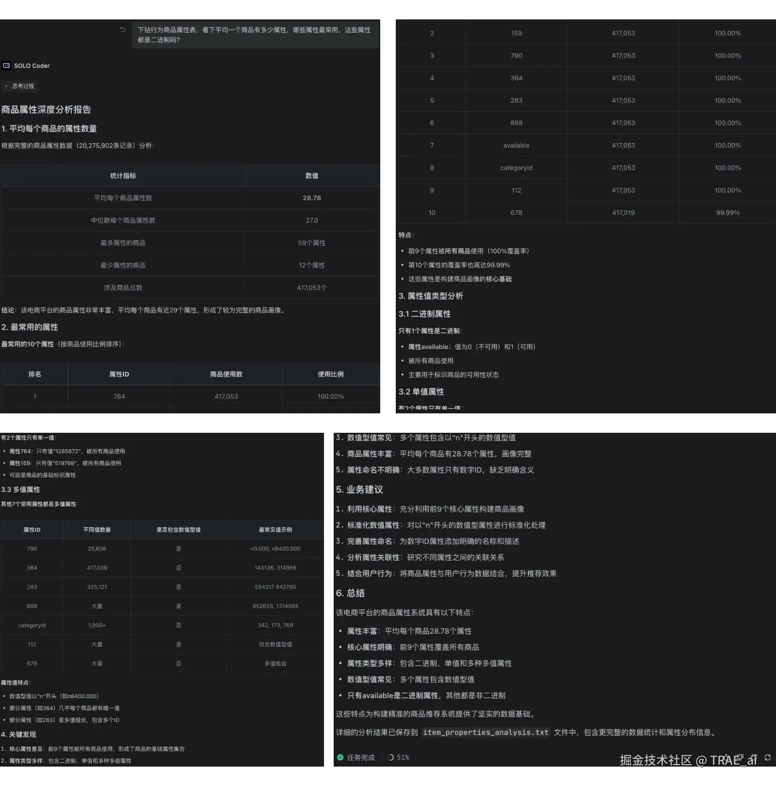 c. 下钻分析商品属性数据,可以看到共计 2000 万条属性记录,涉及 40 万商品,平均一个商品 3 个属性;除了库存(available)和类目(categoryid)这两个属性外,其他属性都被哈希;最常用的前 10 个属性使用占比基本都是 100%