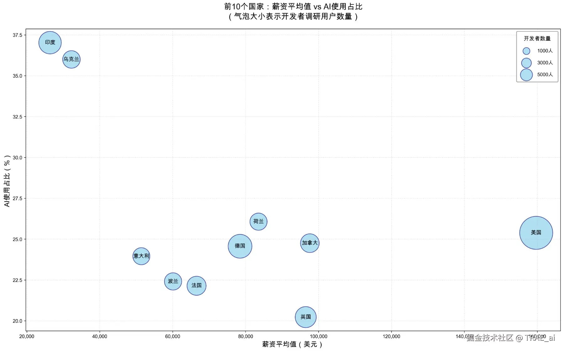 「帮我画一个气泡图,横轴是薪资均值(单位是美金),数轴是每日使用过AI的占比,大小是开发者调研用户数量,展示前10国家,气泡大小适中,注意美观」