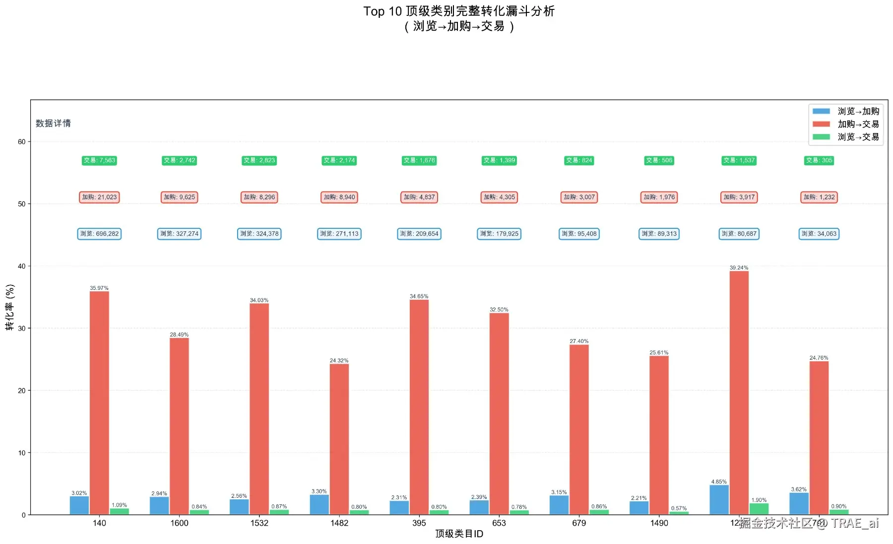 「帮我画一个图,按top 10顶级类别浏览到加入购物车,加入购物车到交易的比例,并在图表的上方,加上每个类目的浏览、加购、交易次数」