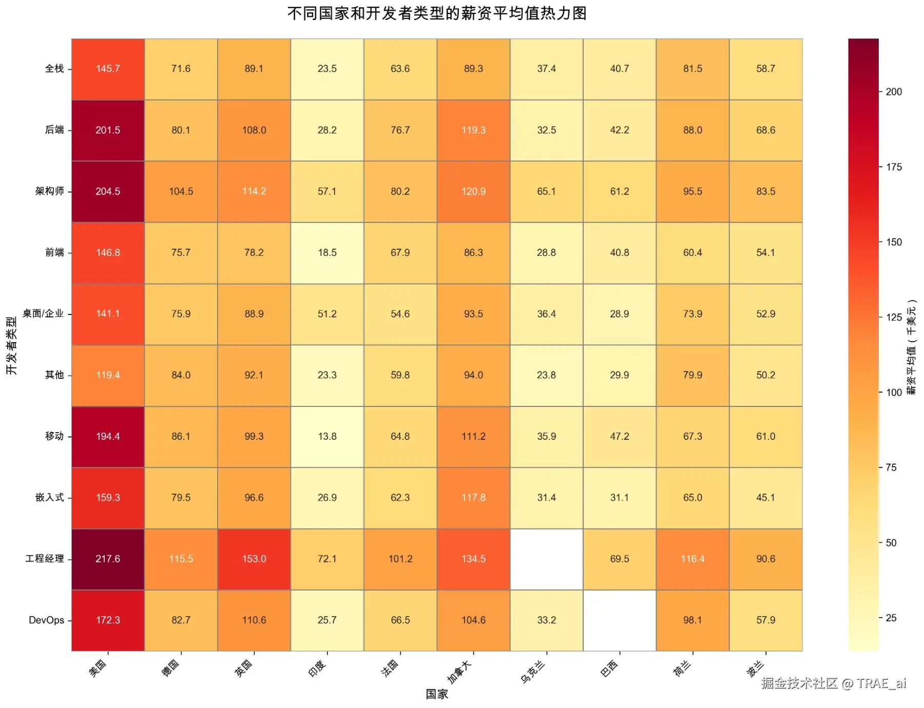 「帮我画一个热力表,横轴是国家(按中文名称),数轴是开发者类型(简写),数值是薪资平均值」