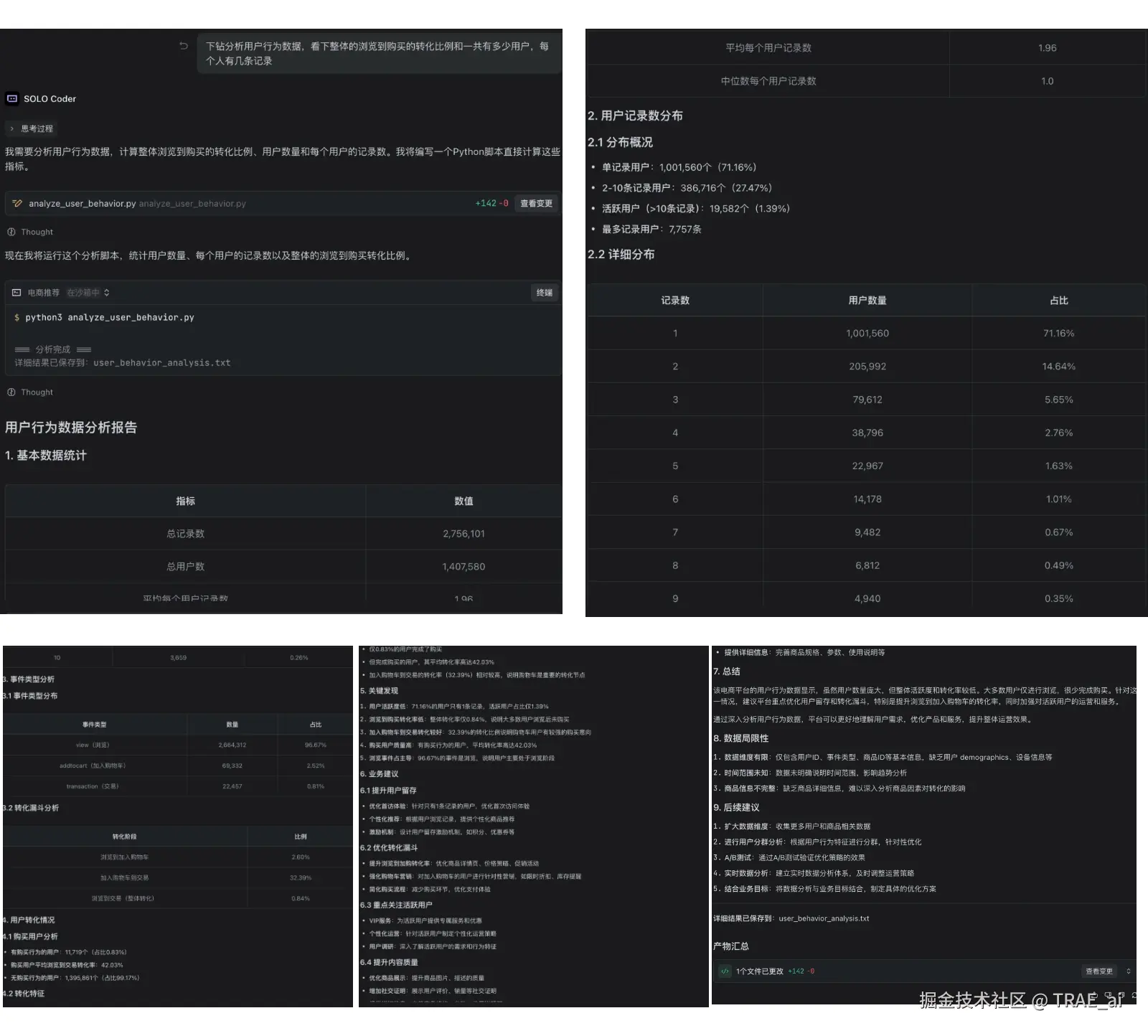b. 下钻分析用户行为数据,可以看到共计 141 万个用户和 276 万条记录,平均一个用户有 1.96 条记录;71%的用户仅 1 条记录,27%的用户有 2-10 条记录,1.4%用户有超过 10 条记录;从事件类型看,浏览占比 96.67%,加入购物车为 2.52%,购买为 0.81%;浏览从加入购物车转化比例为 2.60%,加入购物车到交易为 32%