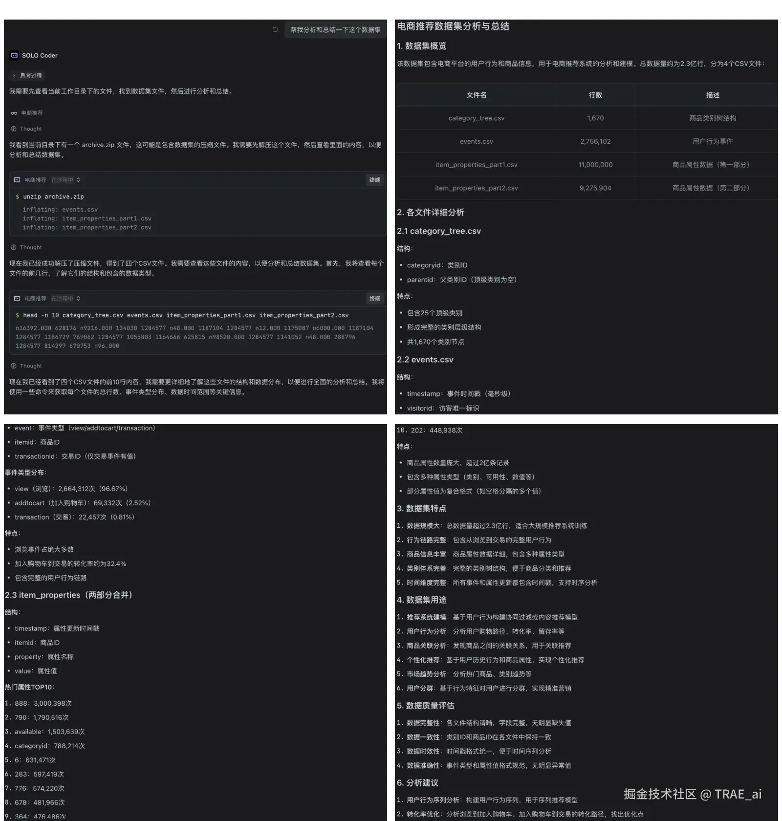 1. 直接在对话框里输入指令,指令可以简单(例如“帮我分析和总结一下这个数据集”) ;可以看到三个文件里,ategory_tree.csv 是商品类别树结构(1670 行);events.csv 是户行为事件(276 万行),主要是三类事情:浏览、加入购物车和交易;item_properties 是商品属性(2000 万行),包含多种属性类型