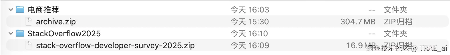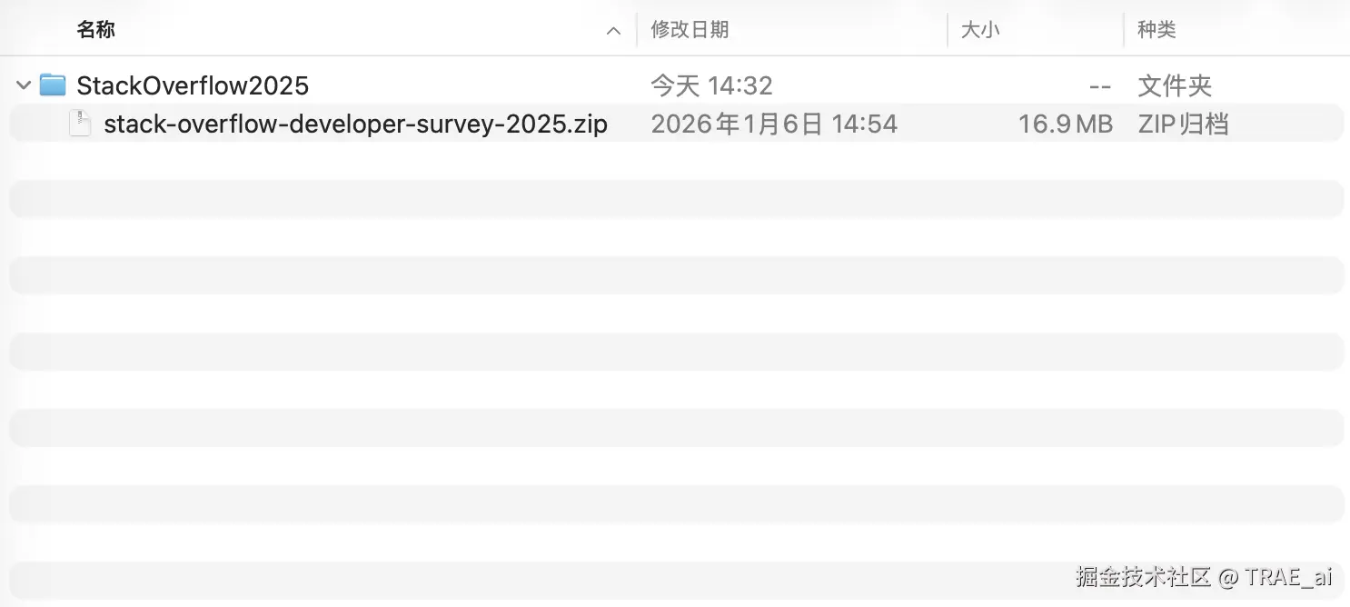 从 survey.stackoverflow.co/ 下载 Stack Overflow 2025 调研数据集,包含「受访者基本信息、技术使用习惯、AI 工具态度」等维度,将数据集保存至本地文件夹(例如 “StackOverflow2025” ),方便后续 TRAE 进行读取。