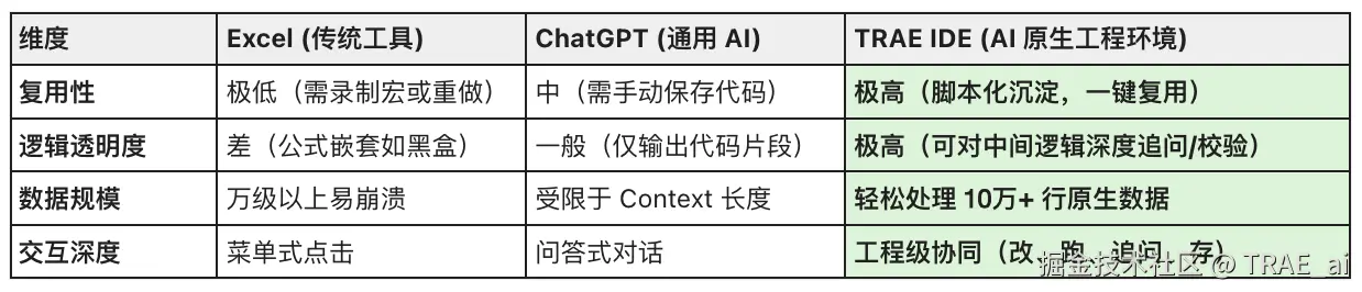 我们把 Excel、ChatGPT、TRAE IDE 基于数据分析的场景进行了多维度对比,可以发现 IDE 在效率、适配性与智能化上全面超越 Excel 与 Chatbot(例如 ChatGPT):
