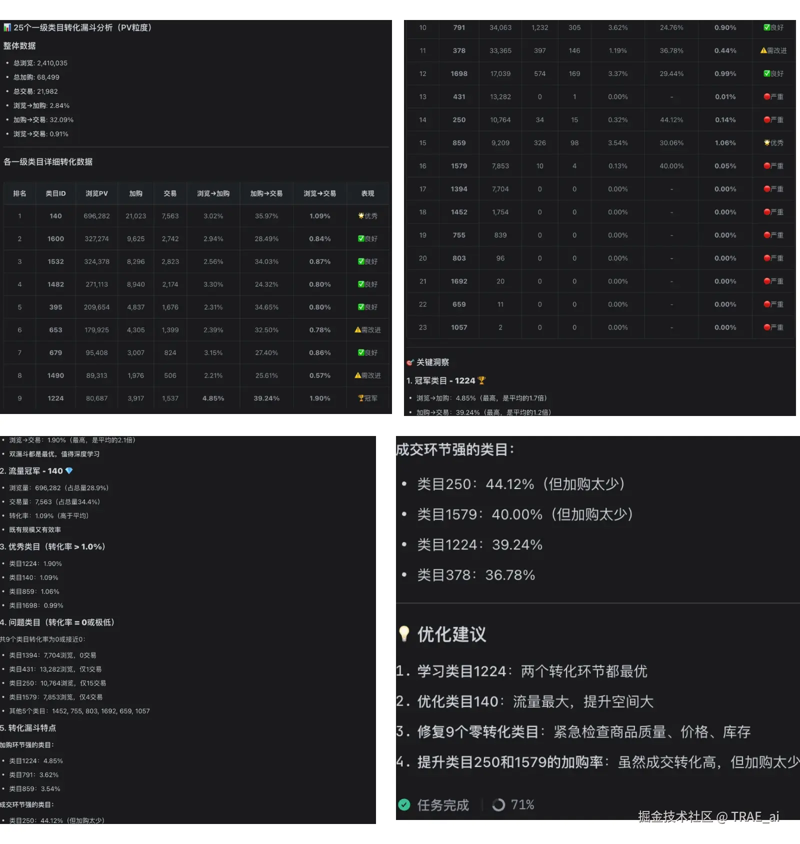 3. 除了单个文件下钻分析外,我们也可以交叉三个文件进行分析,例如按顶级类别看下从浏览到加入购物车到交易的转化比例:可以看到平均转化率为 0.91%,3 个类别(140、1224、859)转化率高于 1%,11 个类别转化率低于 0.5%,其他介于 0.5-1%;7 个类目的浏览量低于 1000,其中 2 个浏览量为 0