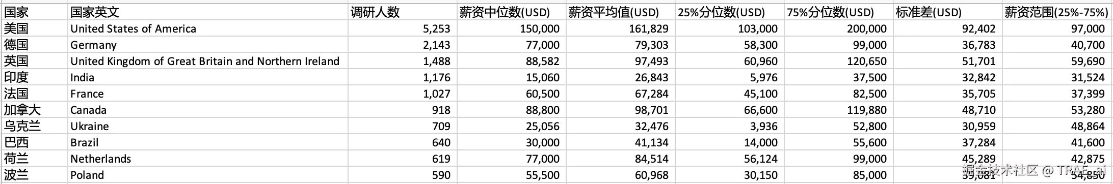 「分析一下不同国家的薪资分布(看一下前10国家,按调研用户数量排序,薪资中位数,均值和25/75分位数,全部换算为美金)」