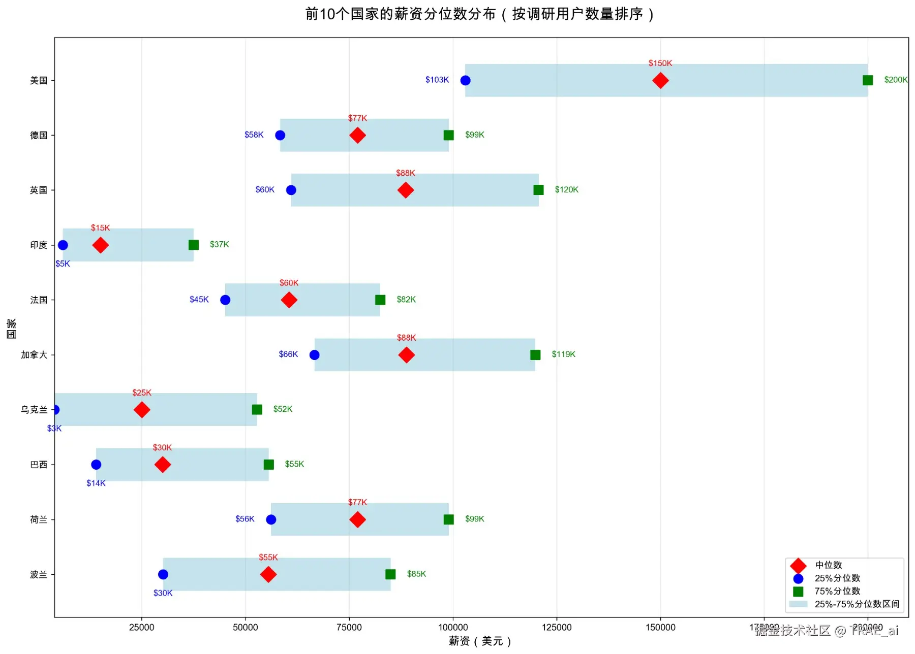 「帮我画一个图,展示每个国家的25/75/中位数 薪资,只需要展示前10国家即可」