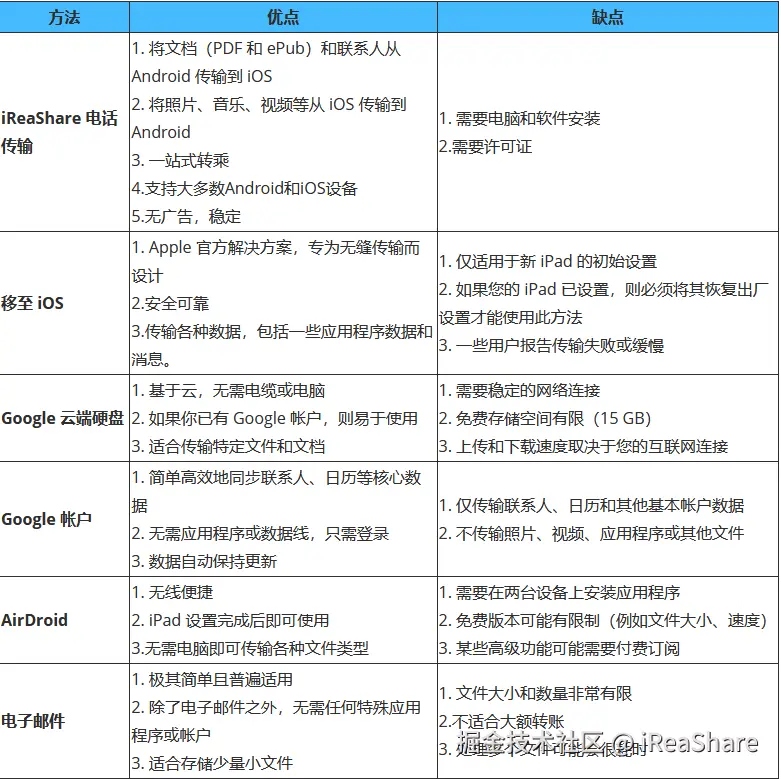 从安卓设备切换到 iPad 并不容易。如果您想要一站式 USB 传输,可以使用iReaShare Phone Transfer ,它非常适合在 iOS 和安卓设备之间传输文件。您还可以使用 Google Drive、AirDroid 等无线方式以及电子邮件。所有这些方式都能让您尽情享受 iPad 带来的乐趣,丝毫不会错过任何精彩。