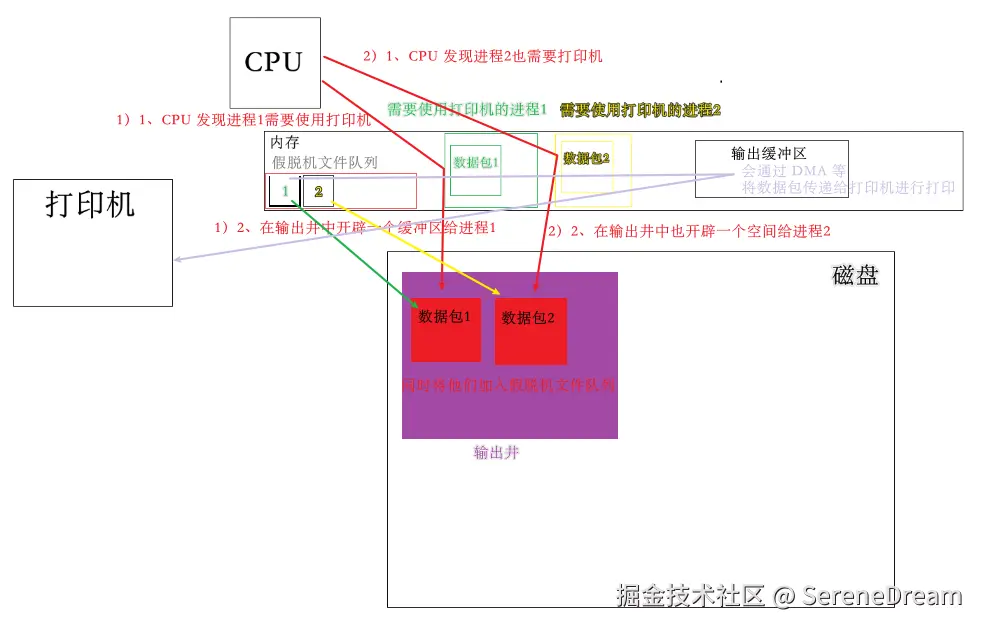 当进程运行在 CPU 上时,向 CPU 请求使用 I/O 设备输出数据时,CPU 会在磁盘中的输出井中申请一个缓冲区,将该进程的请求输出的数据放置在缓冲区内,然后再根据放置的位置以及进程请求的 I/O 设备等信息整合成一个请求输出表,CPU 会把这张表挂载到假脱机文件队列中后会“骗”进程说:“我已经帮你输出了”,接下来进程就可以无需阻塞,可以去执行其他的操作(如果进程需要获取 I/O 设备的输入,也就是需要输入井中的数据,则需要阻塞等待该数据到达),第二个进程想使用同一个 I/O 设备,第三个进程都是使用相同的方法,在输出井中将数据放好了,在假脱机文件队列中挂起了,交由 DMA 去进行操作, DMA 会根据队列内容将每一个进程的输出信息发送给打印机等输出 I/O 设备,就这样完成所有的输出请求