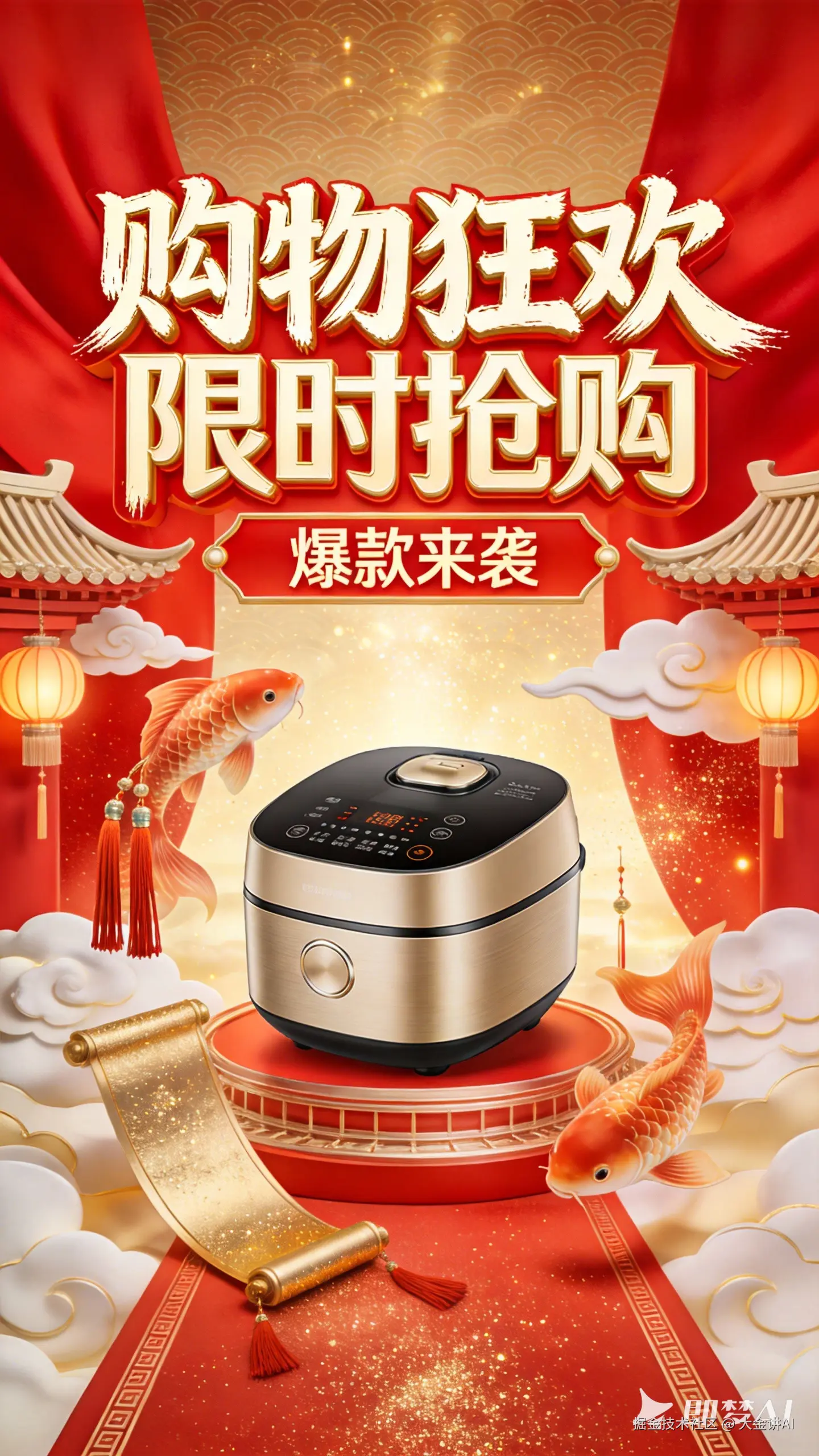 国潮风电商促销海报,红金主色调,融合传统东方美学与现代电商视觉。画面中央展示主打产品,周围环绕祥云、锦鲤、流苏、金色卷轴、宫灯、飞檐等国风元素,背景以红绸、金光、祥云纹理构建节庆氛围。字体设计结合书法笔触与现代几何结构,突出“购物狂欢”“限时抢购”“爆款来袭”等字样。整体构图对称稳重,视觉层次分明,光影柔和带有金粉质感。适配电商详情页、直播间封面、品牌主视觉,支持AI工具替换产品与编辑文案内容。高清4K国潮商业视觉,既有文化底蕴又具现代时尚感。