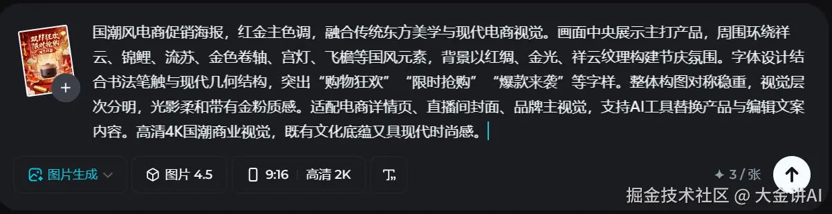 我是后来在连续跑淘宝活动的时候,开始固定用即梦 4.5 生图模型的。它是即梦现在的主力图片模型,属于那种偏“实用出图”的路线,不是只追求艺术感。 它可以用中文直接生成促销海报画面,也支持一次生成多张同风格的图,方便你做整套活动物料。 用在促销海报上,它最实在的优势是:画面结构比较稳、风格不容易跑,你要批量出“满减/秒杀/限时折扣”这种活动图,会省很多返工。