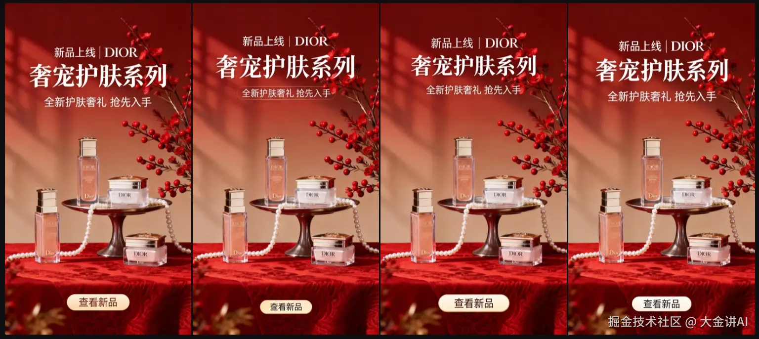 专业商业摄影,简约美妆产品广告风格,居中构图。3款护肤品,修长瓶身搭配通透质感,细节精致。产品分别放在高脚盘和桌面上。桌面上铺着红色纹理布料,高脚盘上垂着一串珍珠,右侧设红色花艺枝条,红色浆果枝。背景为红棕渐变色调,光影柔和细腻,整体营造出浓郁新春年货节氛围,融合东方美学,画面层次丰富、细节饱满,突出产品精致感与节日氛围感的结合。高级有质感。【顶部居中】新品上线 | DIOR 奢宠护肤系列