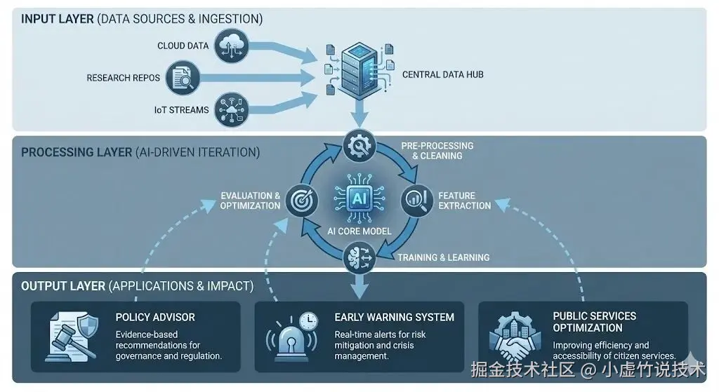 下层(输出): 并列三个面板,展示不同的应用场景(比如政策、预警、服务)。