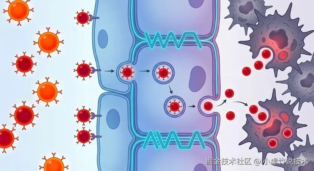 屏障另一边,形状不规则的肿瘤细胞正在吞噬这些颗粒。