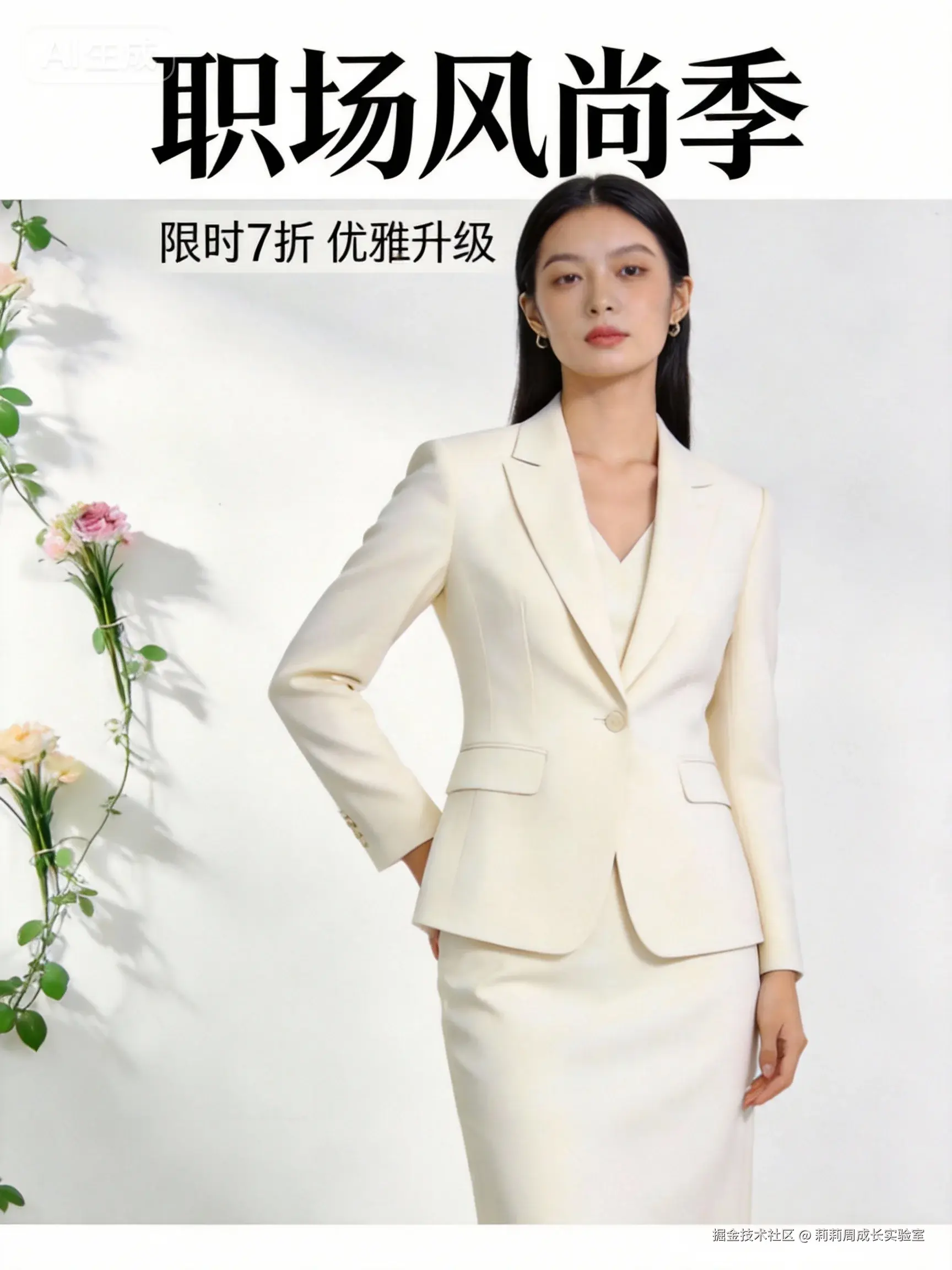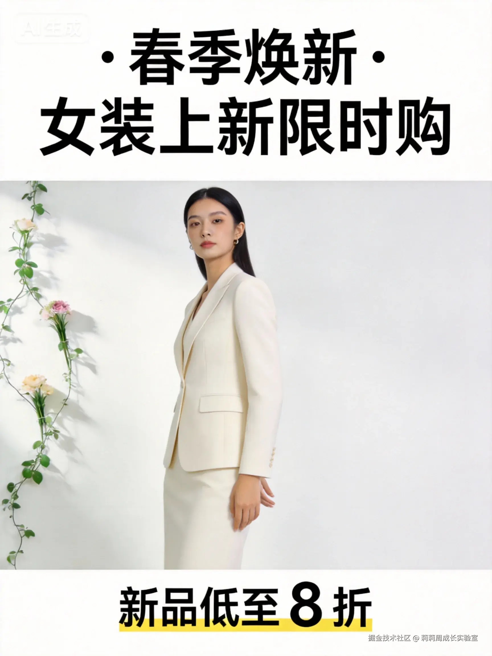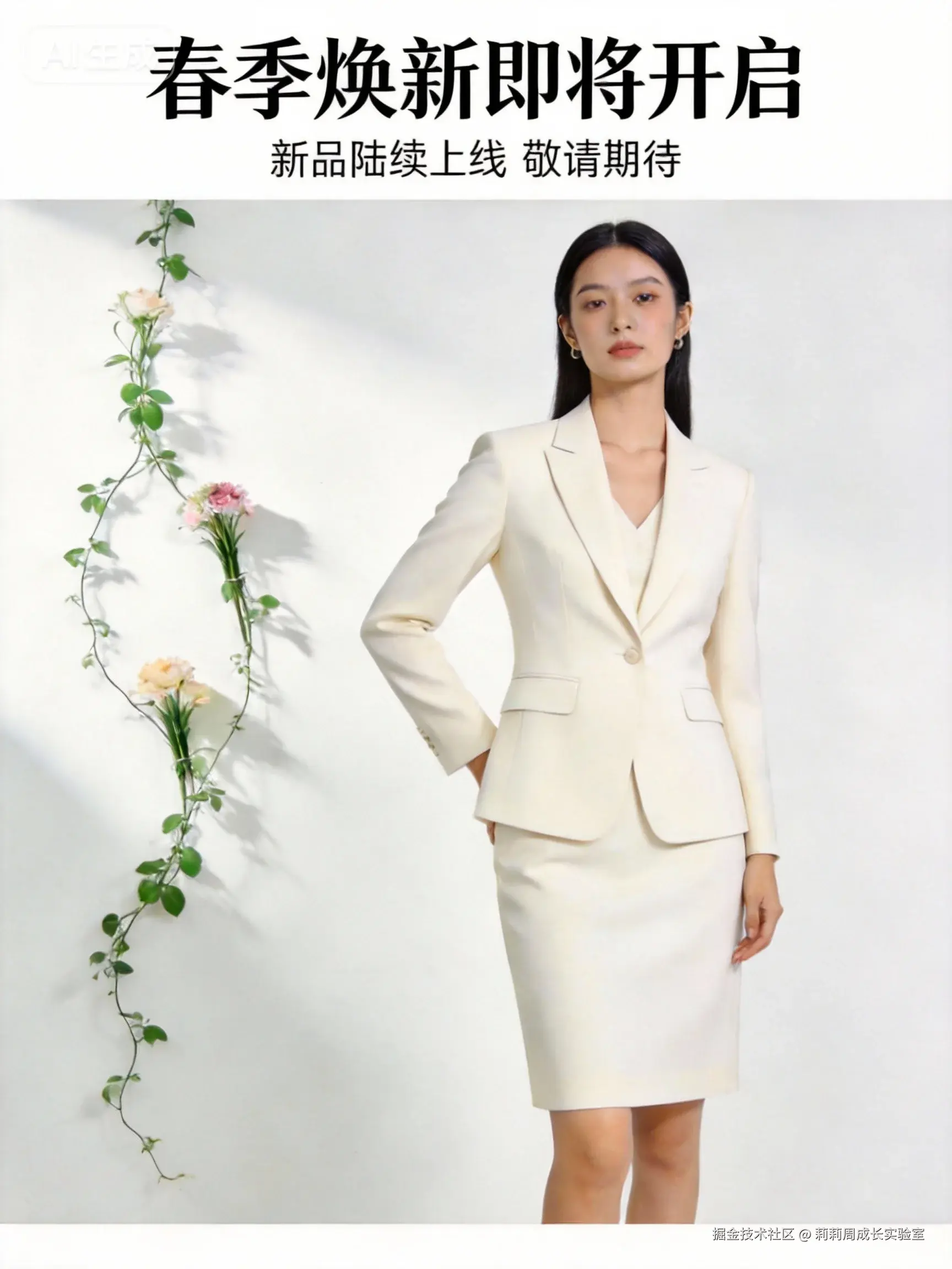 一张女装电商上新海报,商业风格。画面中心是一位身穿米白色西装套裙的模特,表情自信,站姿挺拔。背景是简约的白色墙面,左侧有几缕绿植藤蔓作为点缀,增添春季生机。海报上下方和模特两侧留出干净的区域,方便后期添加“春季焕新”等文案。整体色调为浅色系,氛围清新、高级,有质感。