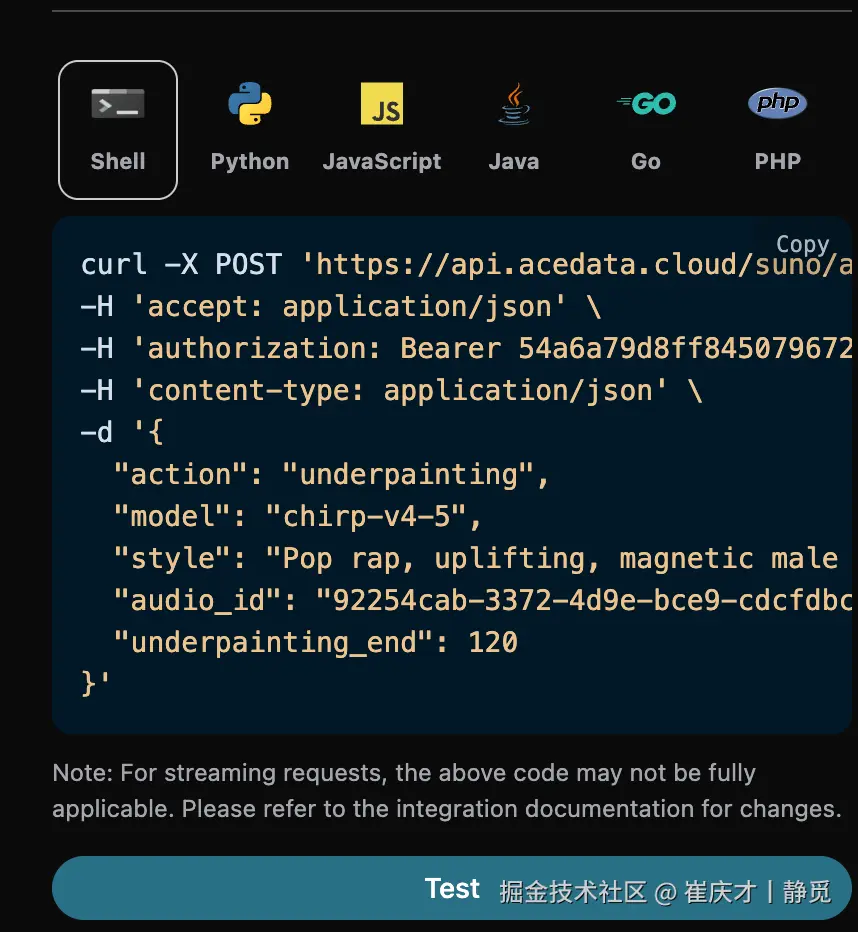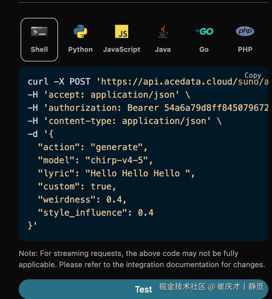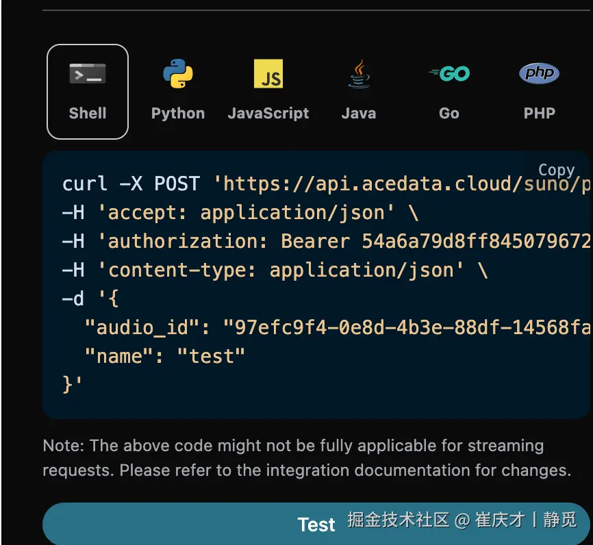要使用 Suno Audios API,首先可以到 Suno Audios Generation API 页面点击「Acquire」按钮,获取请求所需要的凭证: