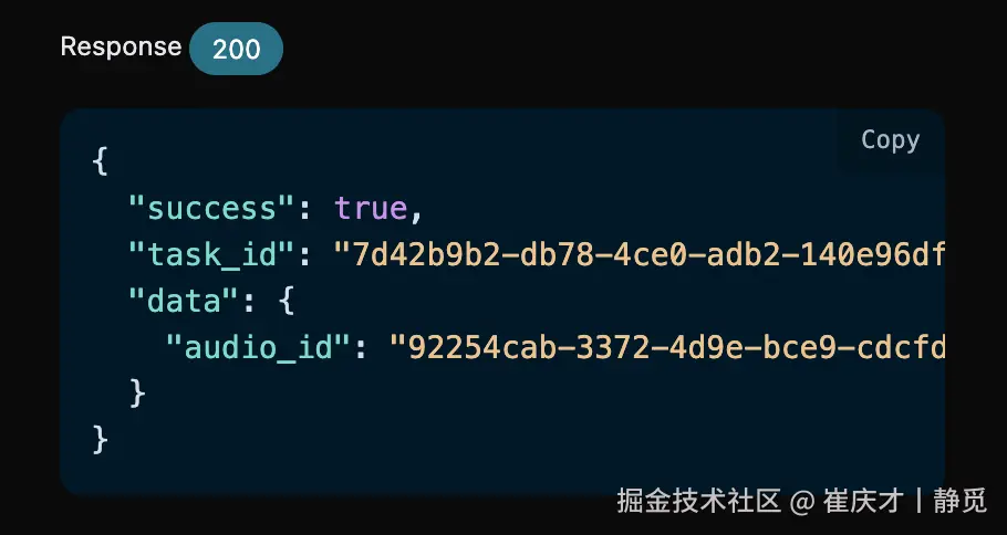 整体流程是:客户端发起请求的时候,额外指定一个 callback_url 字段,客户端发起 API 请求之后,API 会立马返回一个结果,包含一个 task_id 的字段信息,代表当前的任务 ID。当任务完成之后,生成音乐的结果会通过 POST JSON 的形式发送到客户端指定的 callback_url,其中也包括了 task_id 字段,这样任务结果就可以通过 ID 关联起来了。