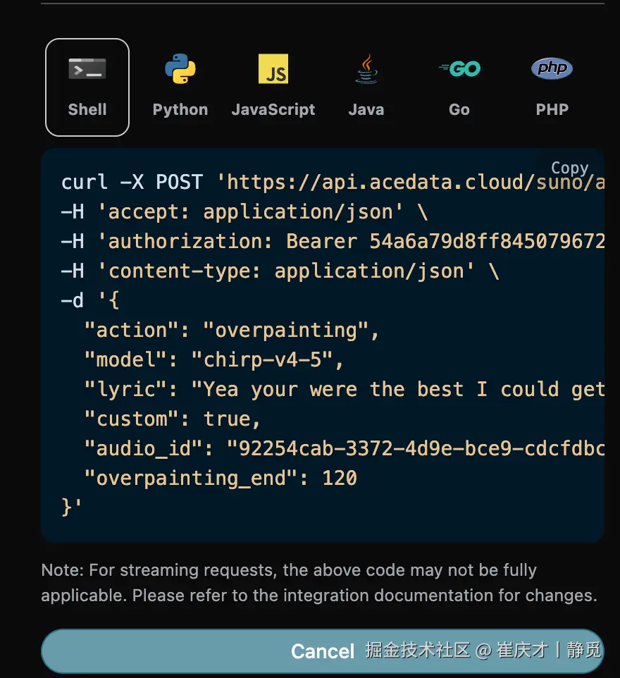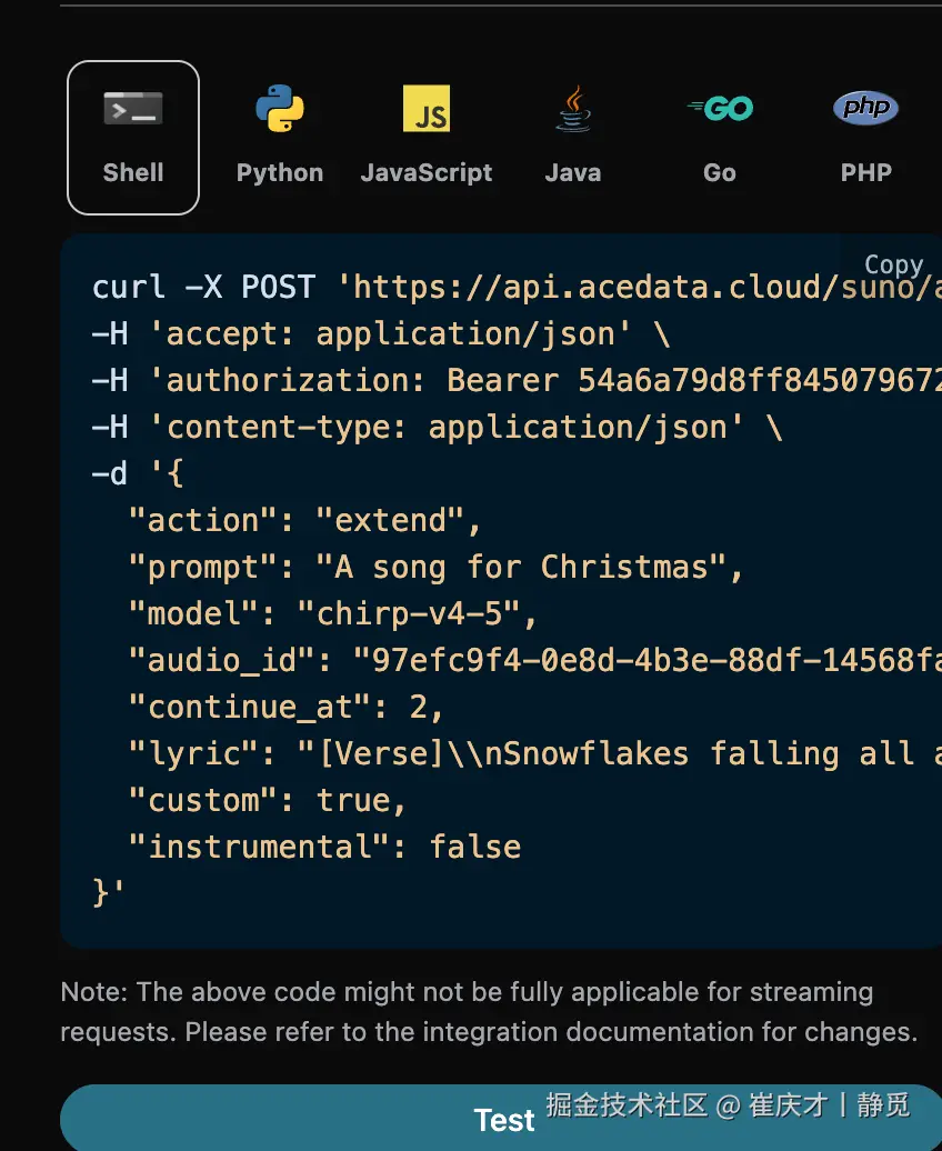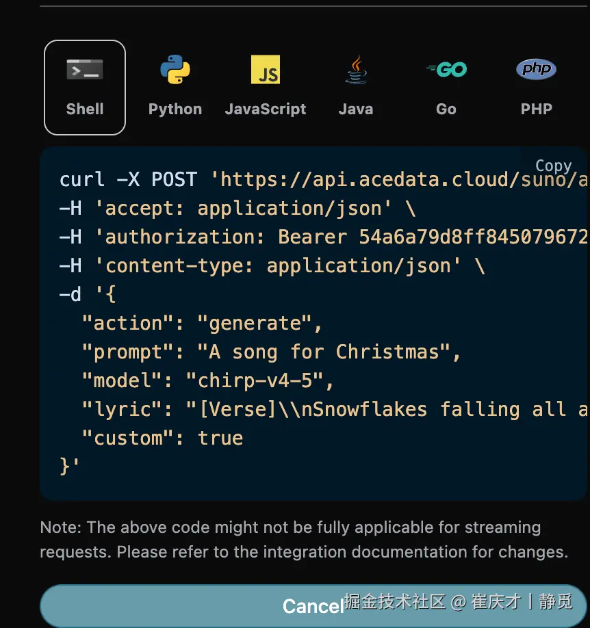 然而 Suno 官方是并没有提供 API 的,AceDataCloud 提供了一套 Suno 的 API,模拟对接了 Suno 官方,可以方便快捷地生成想要的音乐。
