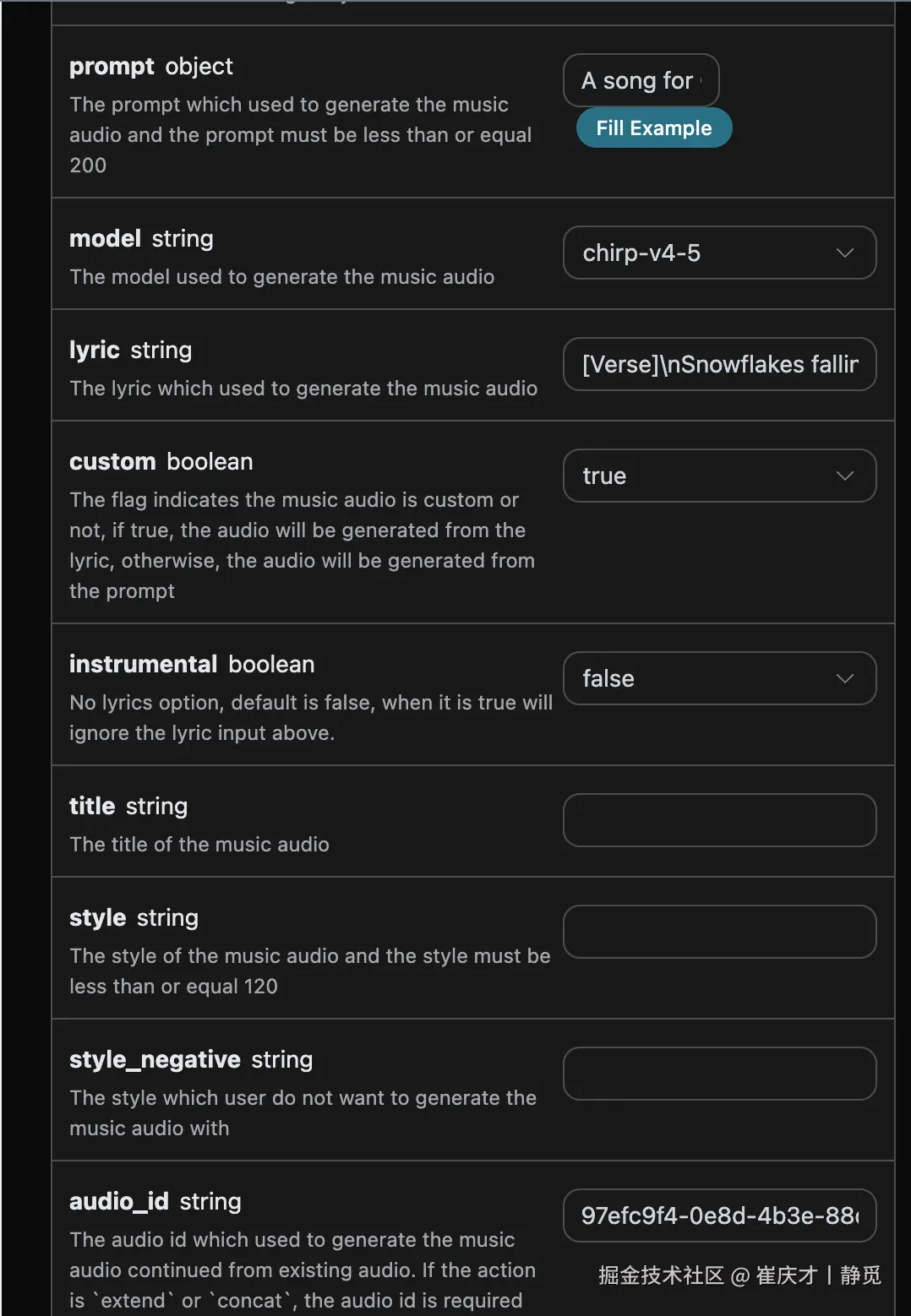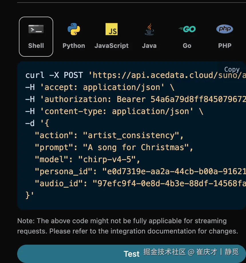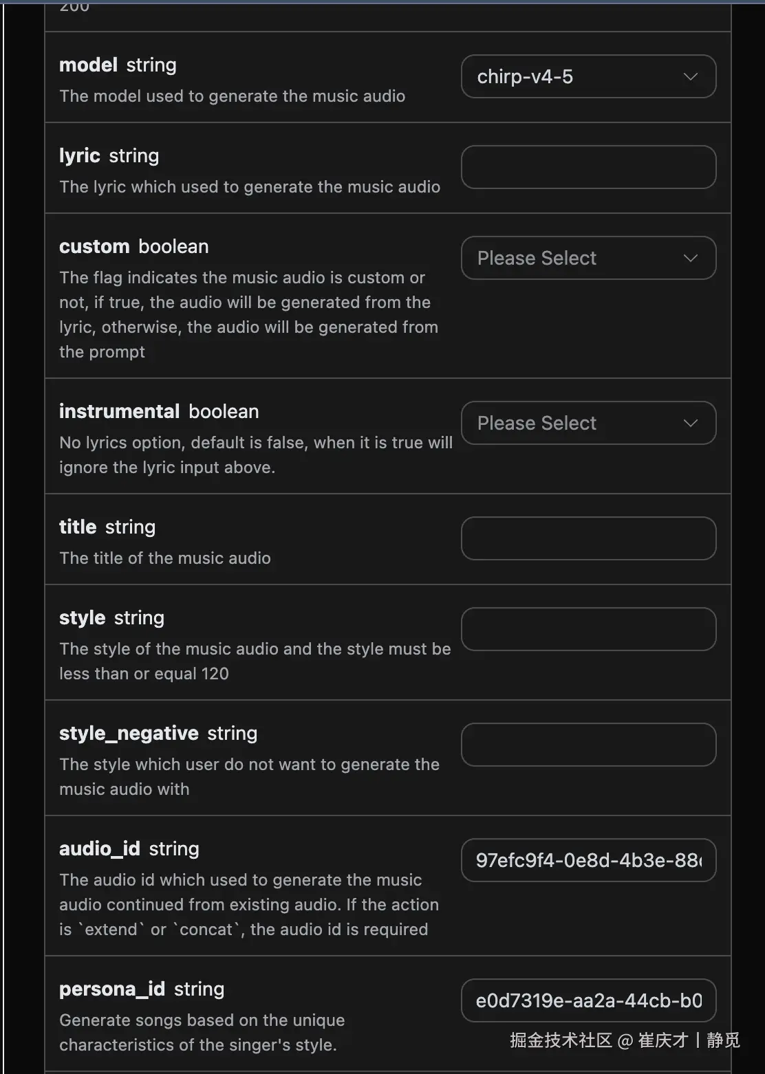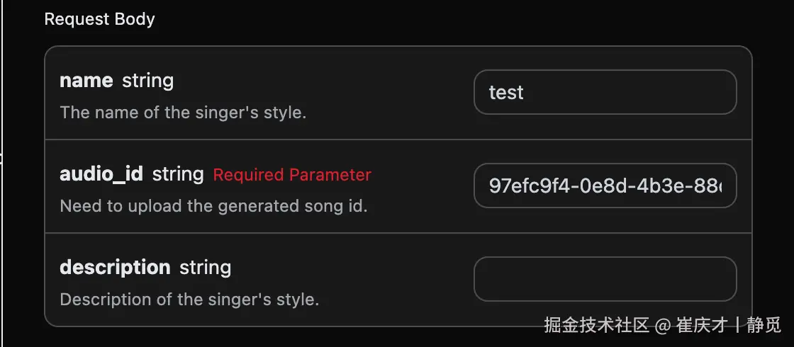 最后得到了需要设置这个歌曲为歌手风格,然后需要进入Suno Persona API根据官方生成的音乐 ID audio_id 来生成一个歌手风格的 id 参数 persona_id,具体的参数如下图所示:
