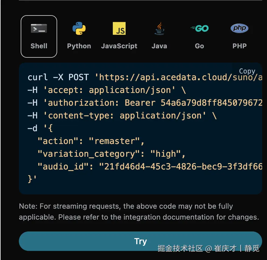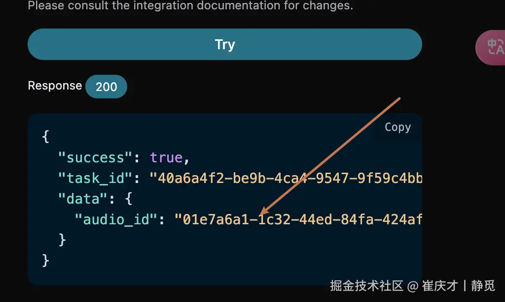 可以点击「Try」按钮直接测试 API,稍等 1-2 分钟,结果如下: