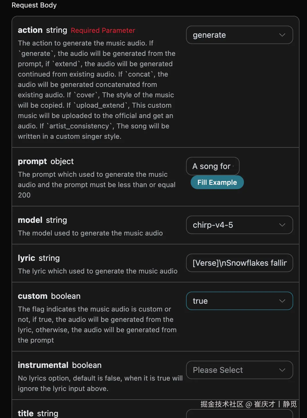 true,代表自定义生成,该参数默认为 false,代表使用prompt生成。 - title:歌曲的标题。