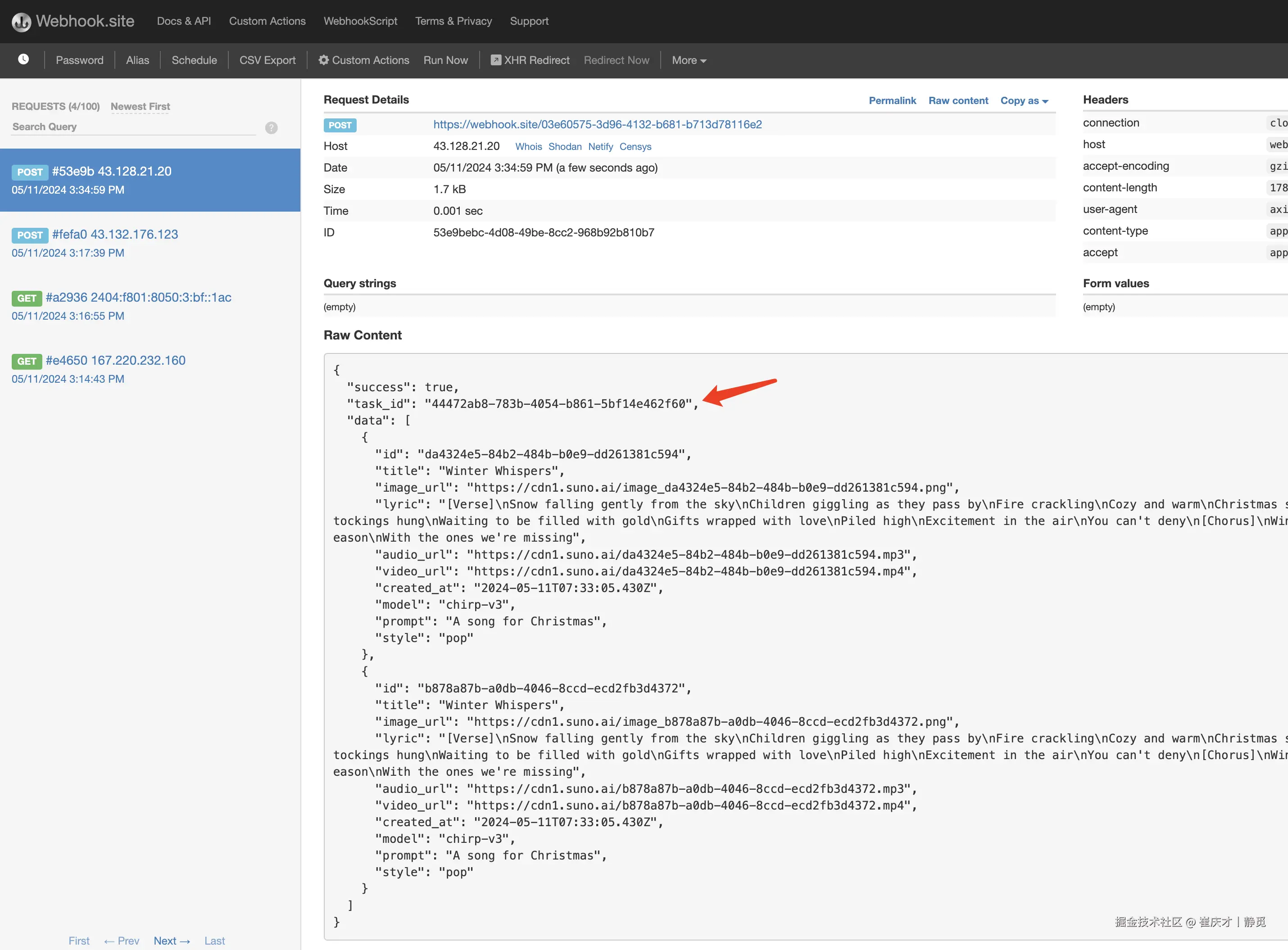 稍等片刻,我们可以在 webhook.site/03e60575-3d… 上观察到生成歌曲的结果,如图所示:
