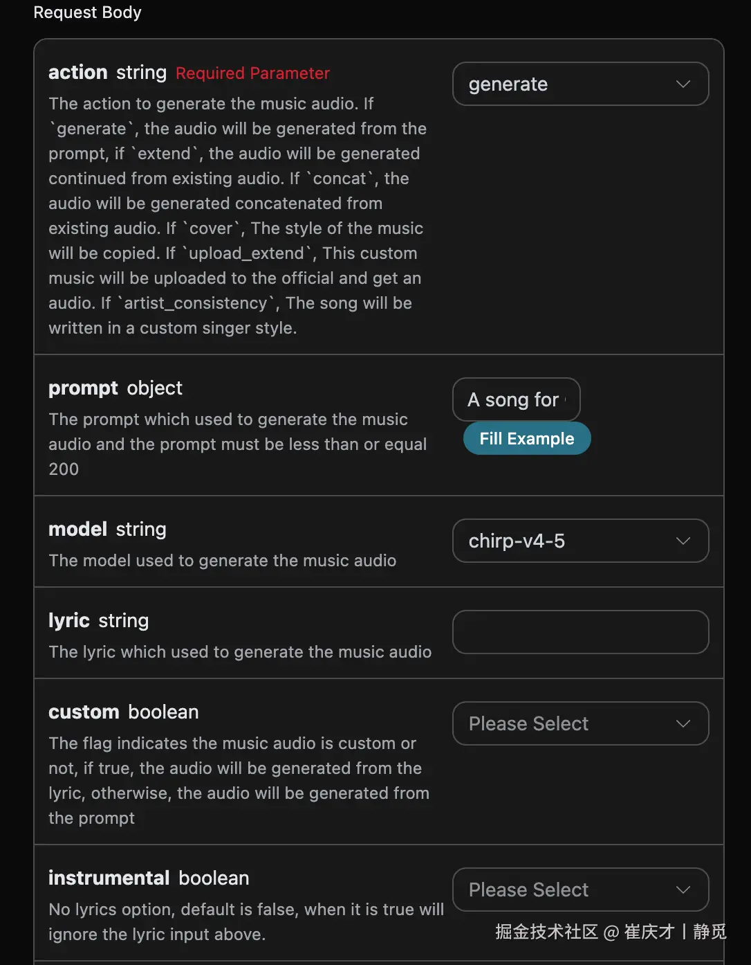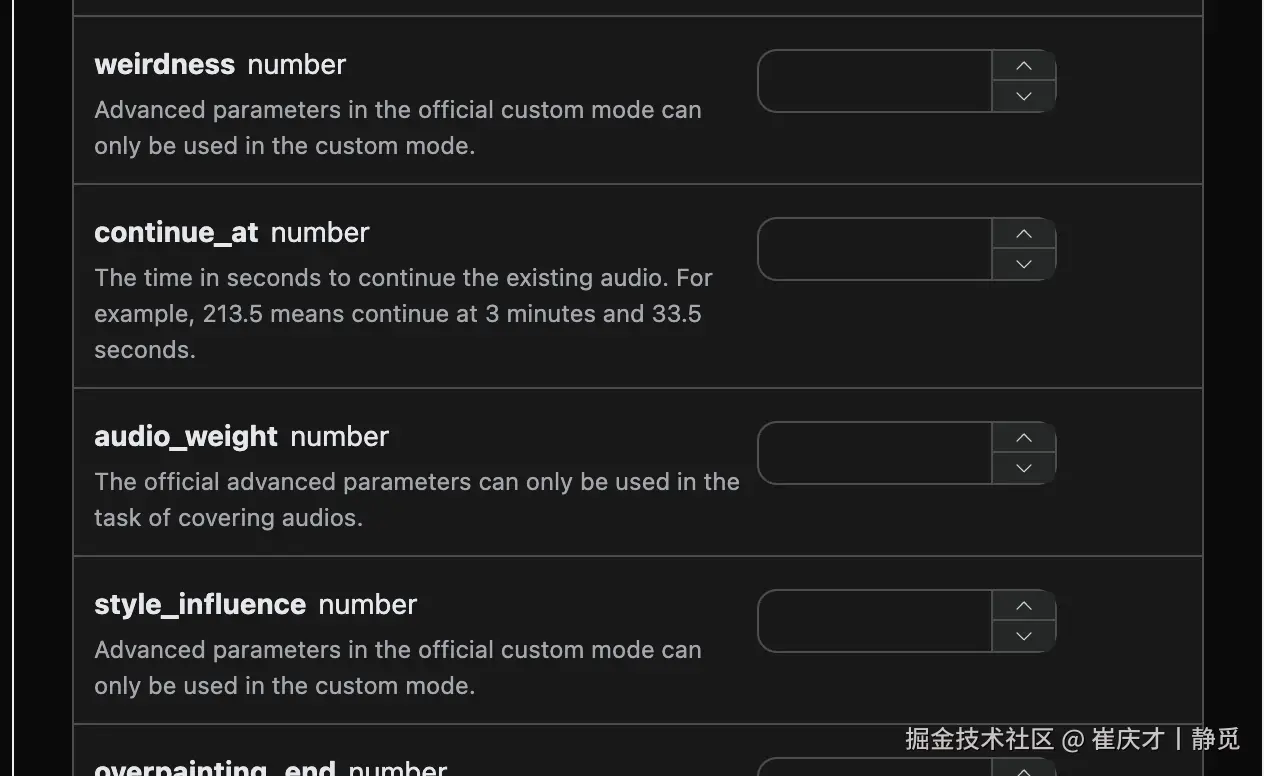 action:此次音乐生成任务的行为,默认是generate,主要包含:extend、upload_extend、cover、upload_cover、replace_section、replace_section、concat、stems、all_stems、remaster。prompt:Suno 官方的灵感模式的提示词。model:此次音乐生成任务的模型,默认是chirp-v3-5,主要包含:chirp-v3、chirp-v4、chirp-v3-5、chirp-v4-5、chirp-v4-5-plus、chirp-v5。lyric:Suno 官方的自定义模式的歌词内容。custom:是否采用自定义模式,默认是:false。instrumental:Suno 官方的灵感模式的纯音乐选项。title:Suno 官方的自定义模式的音乐标题。style:Suno 官方的自定义模式的音乐风格。style_negative:Suno 官方的自定义模式的排除风格。audio_weight:上传的参考音频占比,范围 0-1,越大越依赖参考音频。audio_id:参考音乐的 ID。overpainting_start/overpainting_end:为已有纯音乐补充人声的起止时间,单位秒。underpainting_start/underpainting_end:为清唱加伴奏的起止时间,单位秒。persona_id:艺术家的歌曲 ID。continue_at:以秒为单位继续现有音频的时间。例如,213.5 表示继续到 3 分 33.5 秒。style_influence:style_influence高级参数。replace_section_end:替换片段的最终时间。replace_section_start:替换片段的起始时间。vocal_gender:控制男女声,女声f,男声m,4.5 及以上模型有效。weirdness:weirdness高级参数。lyric_prompt:生成歌词的 prompt,当且仅当custom为true并且lyric没有传的时候生效。callback_url:需要回调结果的 URL。