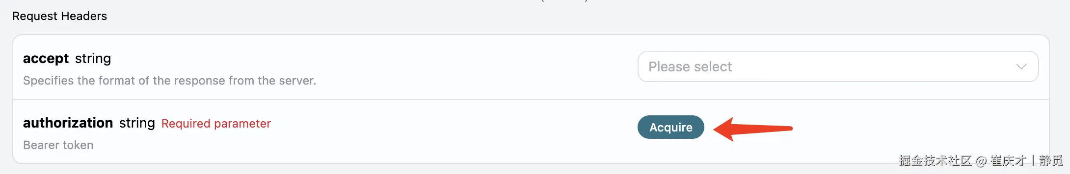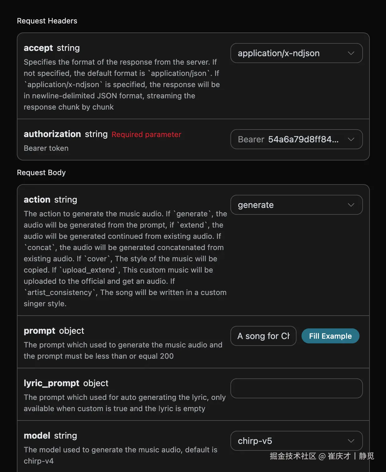 accept:想要接收怎样格式的响应结果,这里填写为application/json,即 JSON 格式。authorization:调用 API 的密钥,申请之后可以直接下拉选择。