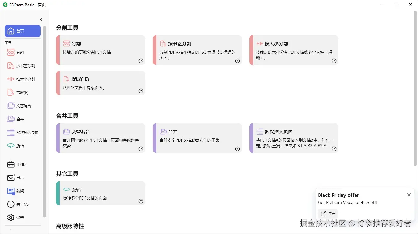 PDFsam Basic v5.4.5 是一款免费开源的 PDF 处理工具,主打 PDF 分割与 PDF 合并两大核心操作,同时还支持提取页面、交替混合、旋转、多次插入页面等丰富的 PDF 处理功能,其绿色版可直接打开使用,无需繁琐操作,能轻松满足个人日常及办公场景中的各类 PDF 文件处理需求,是一款高实用性的 PDF 办公辅助工具。