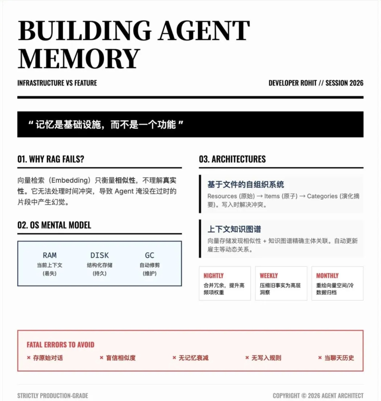 核心原则:记忆是基础设施。像操作系统管理内存一样管理记忆,Agent 才能长期可靠地工作。