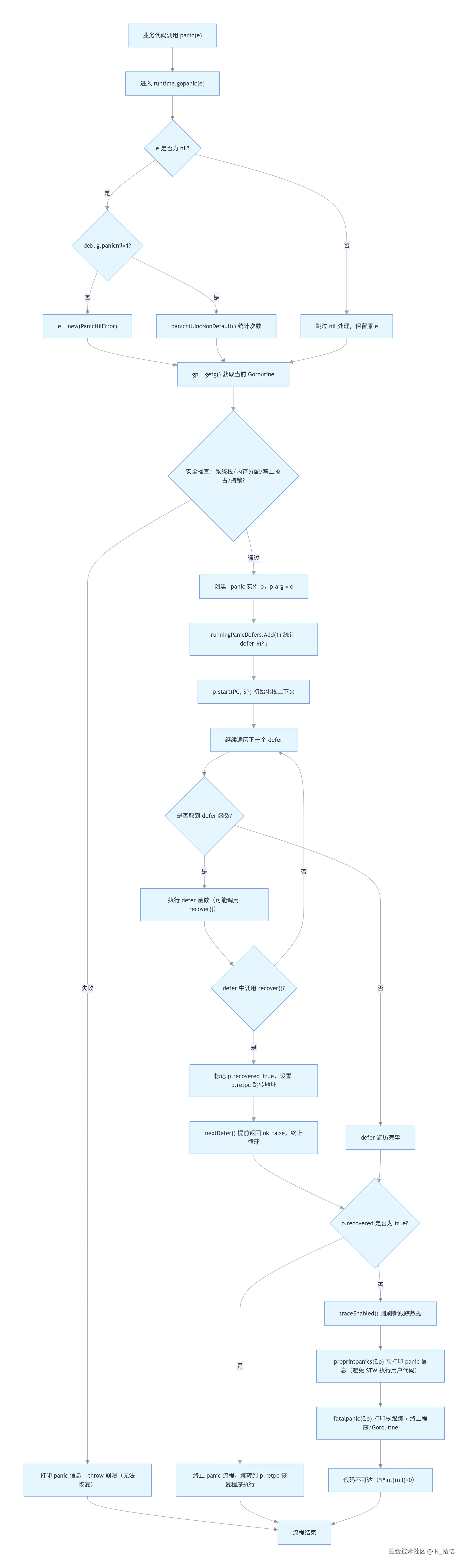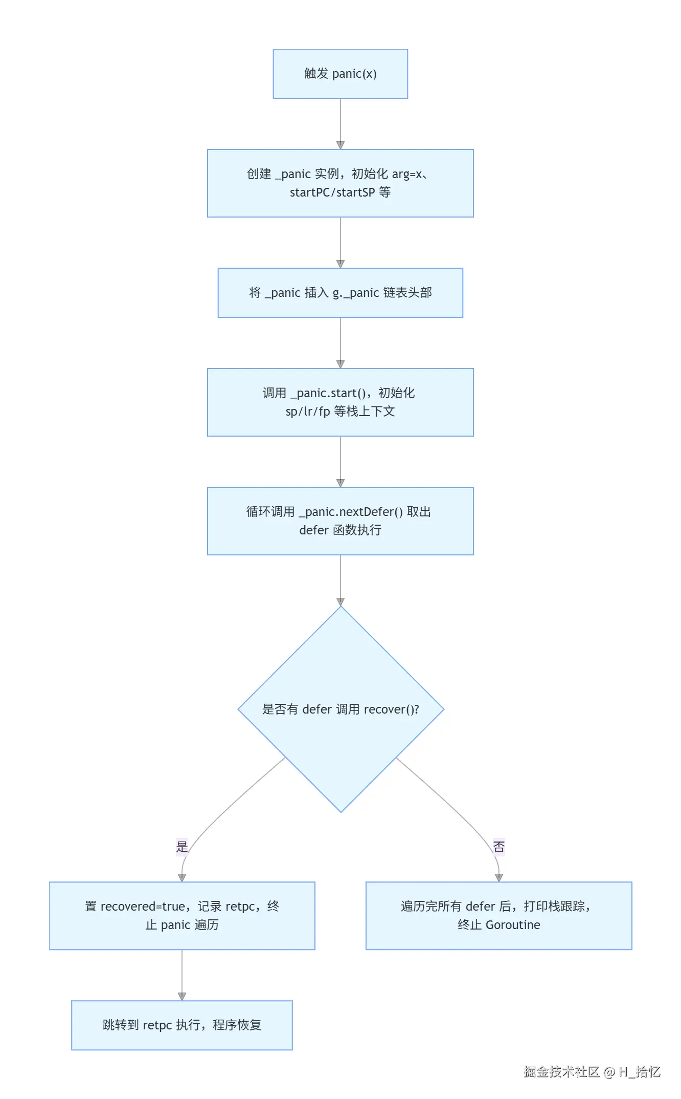 9). 初始化 panic 上下文:传入调用 gopanic 时的 PC/SP,关联当前栈帧 . 让 _panic 定位到当前函数的 defer 链表,准备遍历执行 .