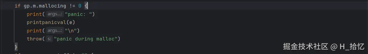 4). 安全检查2:禁止在内存分配期间 panic(mallocing 标记为 1 表示正在分配内存).