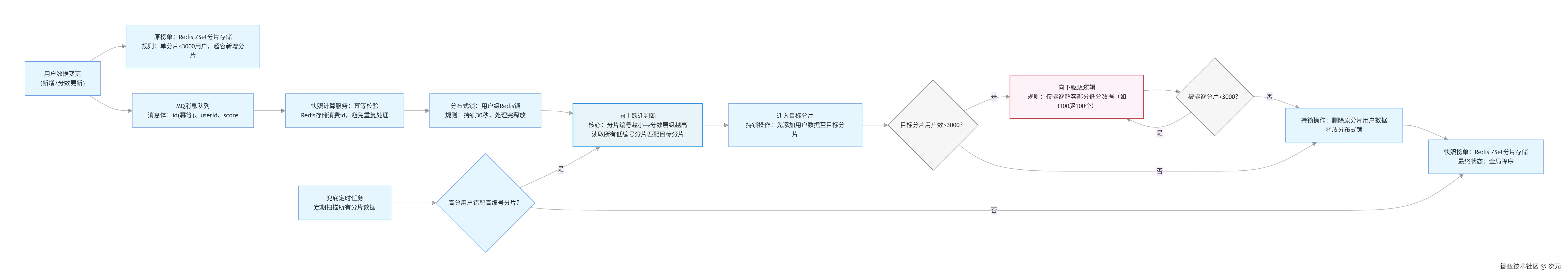 - 分片跃迁与驱逐:消费消息后计算用户分片归属(分片编号越小,分数层级越高),需读取当前用户所在分片编号更小的所有分片,判断目标跃迁分片;若用户迁入后目标分片用户数超 3000 上限,将该分片超过 3000 部分的低分数据向下驱逐(如分片用户数为 3100,则驱逐 100 个低分用户);若被驱逐的分片接收数据后仍超 3000 上限,继续对其执行低分数据向下驱逐,直至所有涉及的分片用户数均≤3000;