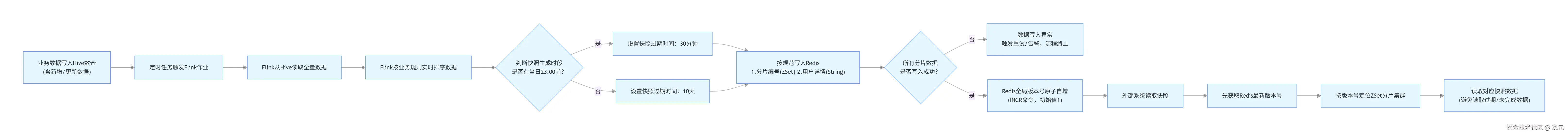 本方案需搭建一套从 Hive 数仓到 Redis 缓存的完整数据处理流程,核心围绕实时数据更新、版本号统一管控、数据规范存储、差异化过期策略落地,具体方案如下: