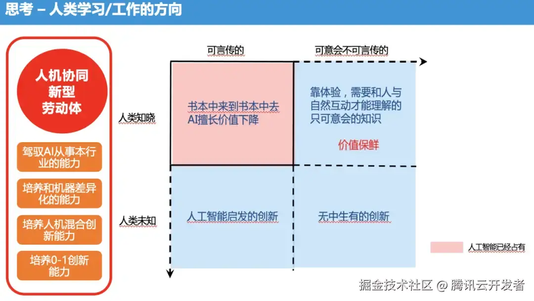 在大模型时代,AI 一上来就通过海量数据“打掉”了人类的前两个境界,而在“一叶知秋”层面的超越也只是时间问题。这意味着,如果我们过去的教育依然只努力培养博闻强识的学生,那在 AI 面前将不名一文。作为架构师,必须利用 AI 形成人机混合的战队,在更高维度的境界中寻找生存空间。