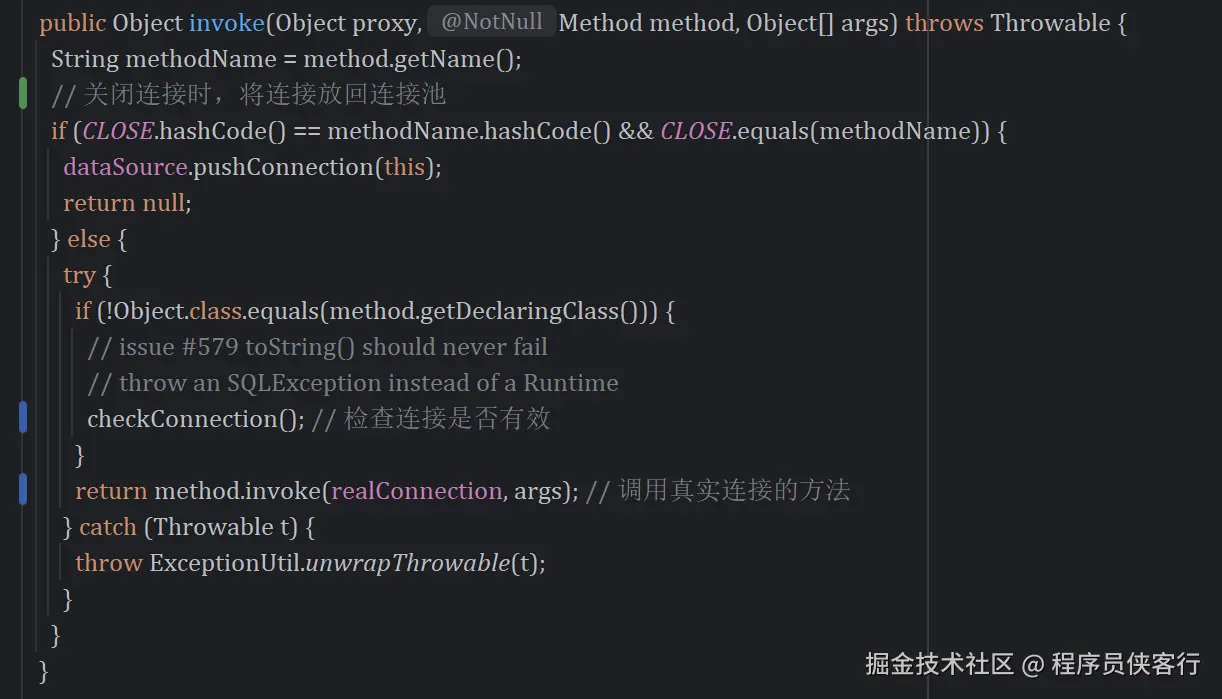 PooledDataSource池中其实是PooledConnection对象(并没有实现Connection接口),它持有Connection实例、Connection代理对象,并且实现了InvocationHandler接口,声明了动态代理逻辑: