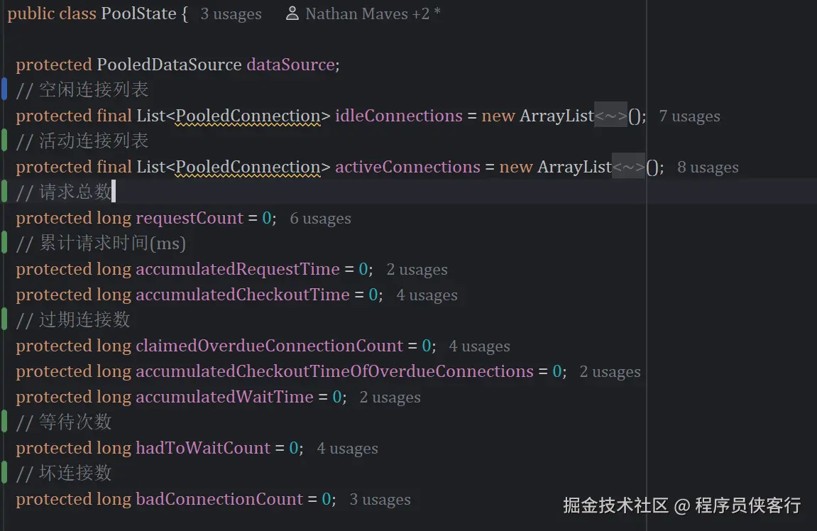 连接池状态主要参数如下,使用中连接、空闲连接分别放在不同的List。
