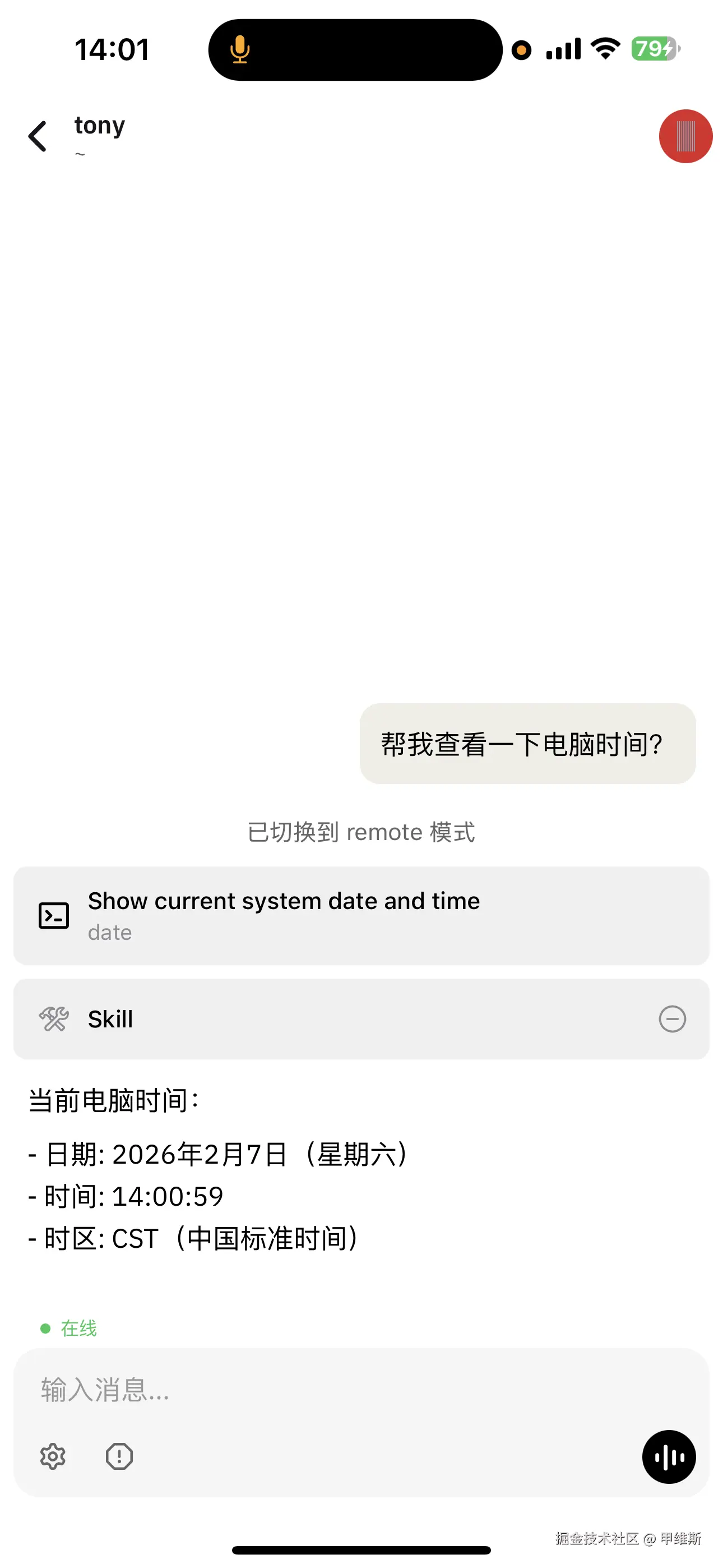 比如试探性地问一下,现在电脑时间是什么?很快就能返回结果了,并且会显示调用的命令和技能。