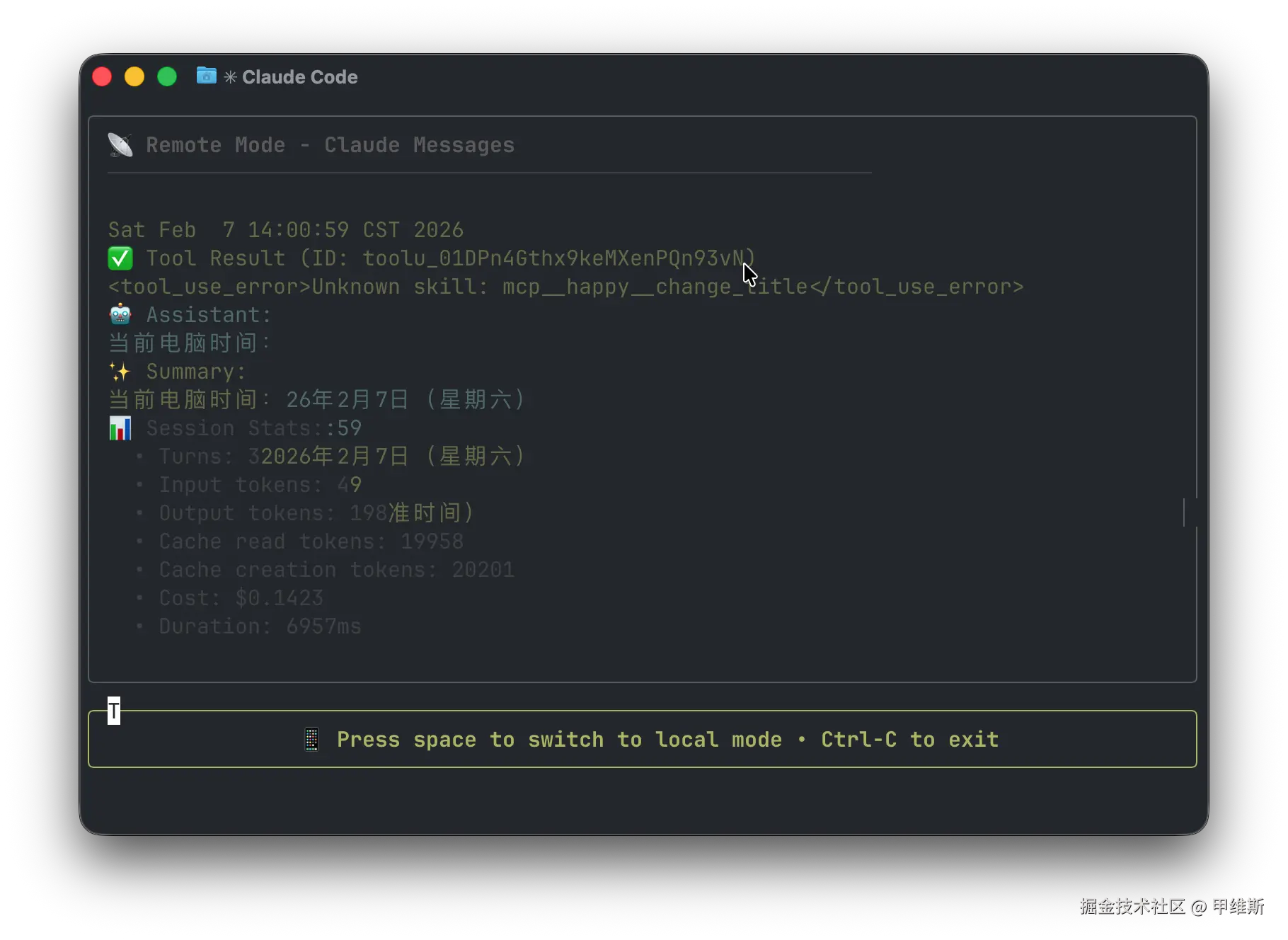 底部还有一个提示叫 Press Space to switch to local mode, Ctrl+C to exit。
