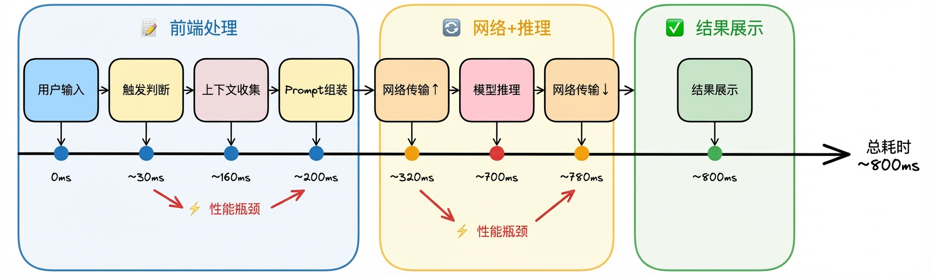 全链路延迟分析显示:模型推理占 50%,网络传输占 25%,其余 25% 分散在触发判断、上下文收集、Prompt 组装等环节。这意味着优化策略必须以模型推理为核心,同时覆盖上下文收集和网络传输。